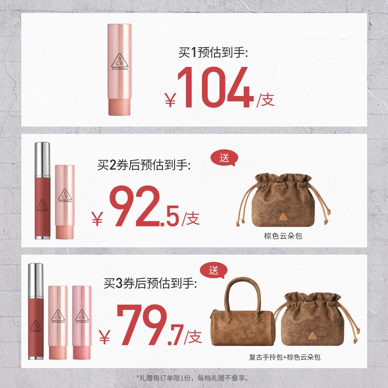 天【彩妆礼物】3CE水雾唇露丝绒唇釉口红唇膏裸色不易沾杯女送礼