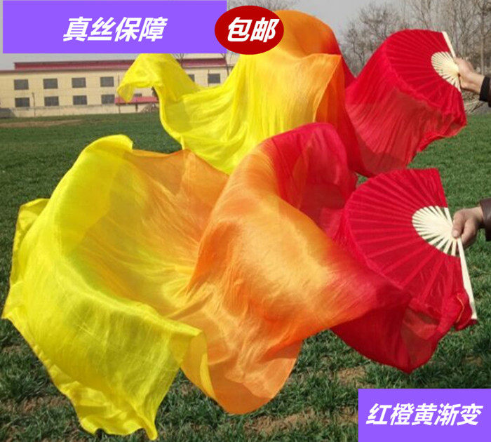 淘真丝双面胶州秧歌九儿中国红大红渐变广场长丝绸演出跳舞道具扇子