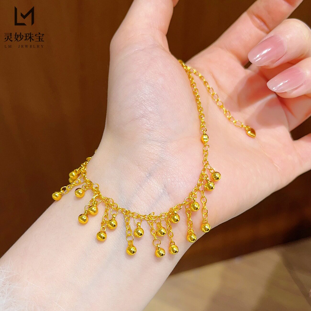 淘宝新中式古法越南沙金亮面双层小圆珠流苏脚链珠脚饰精致时尚送女友