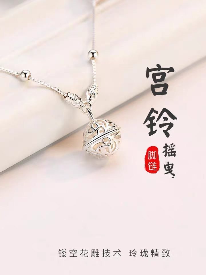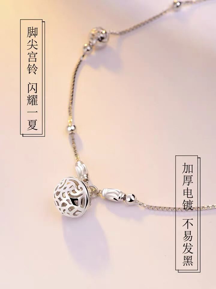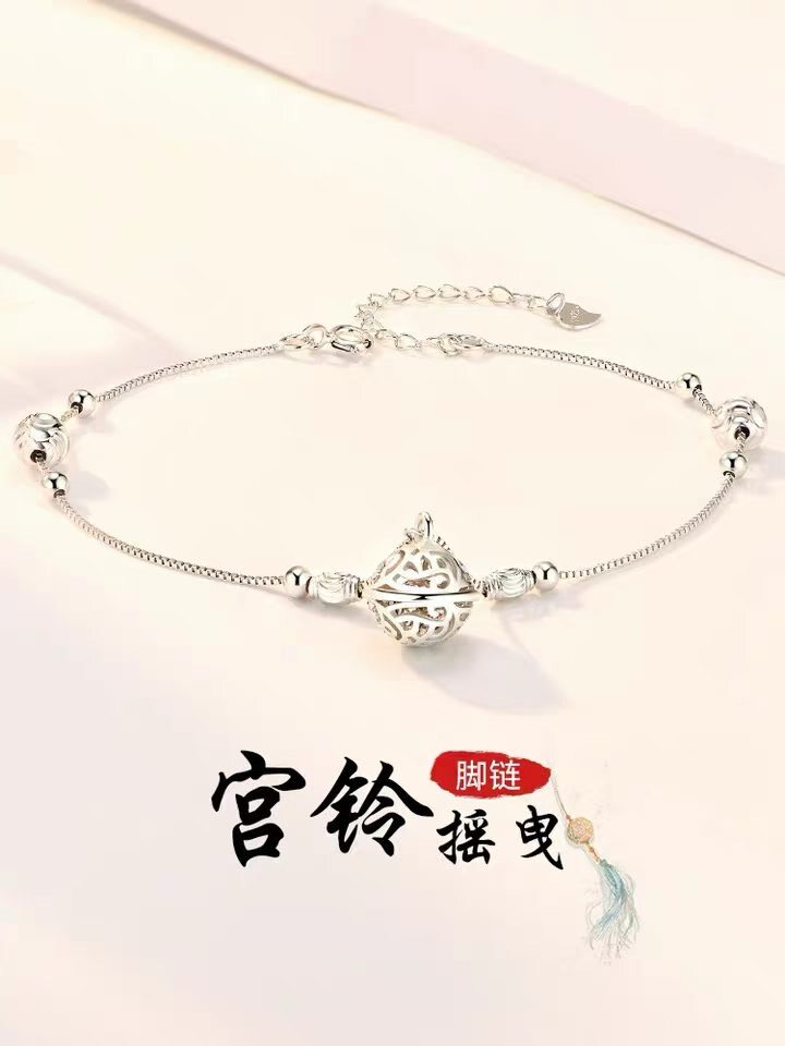 淘宝纯银990足银宫铃脚链女镂空铃铛复古风转运珠圆珠足饰脚饰新款