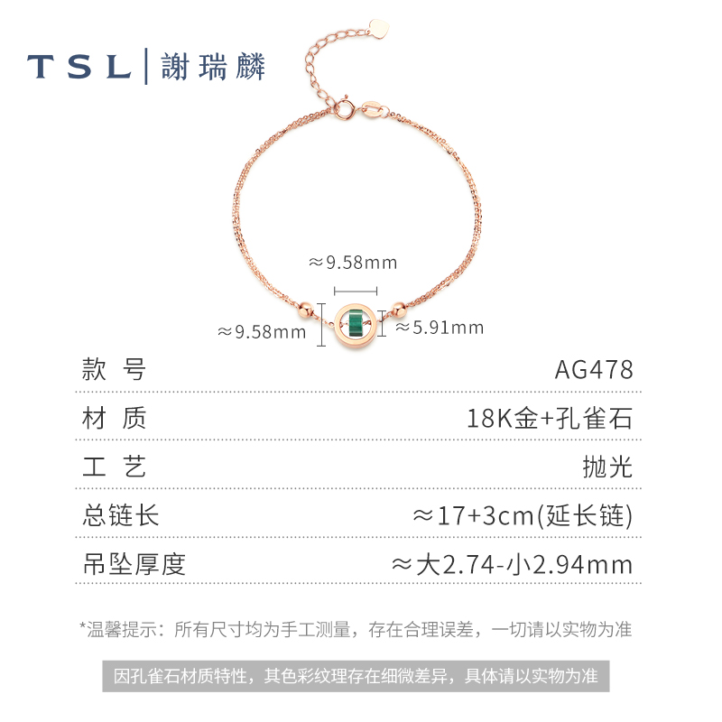天猫TSL谢瑞麟旋转光环18K金手链玫瑰金孔雀石手饰女士AG478