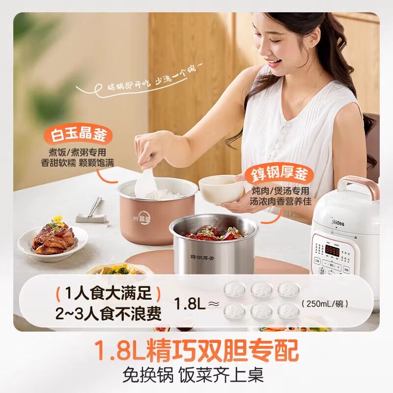 天猫美的电压力锅0涂层钢胆家用1人2-3小型迷你多功能高压电饭锅一体