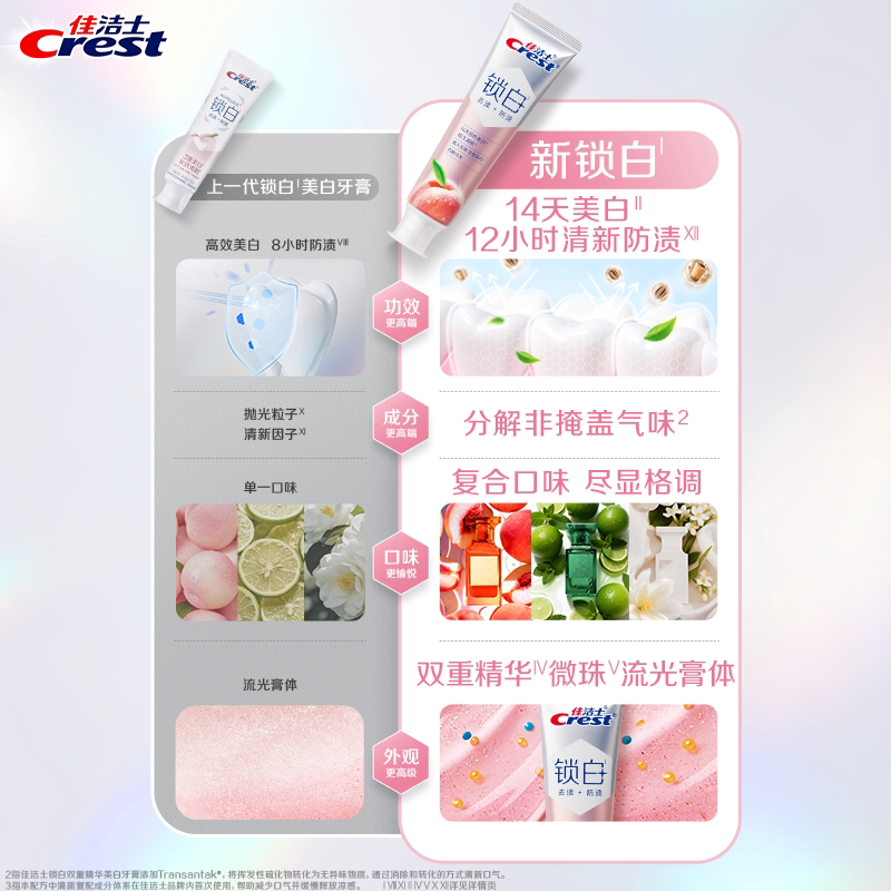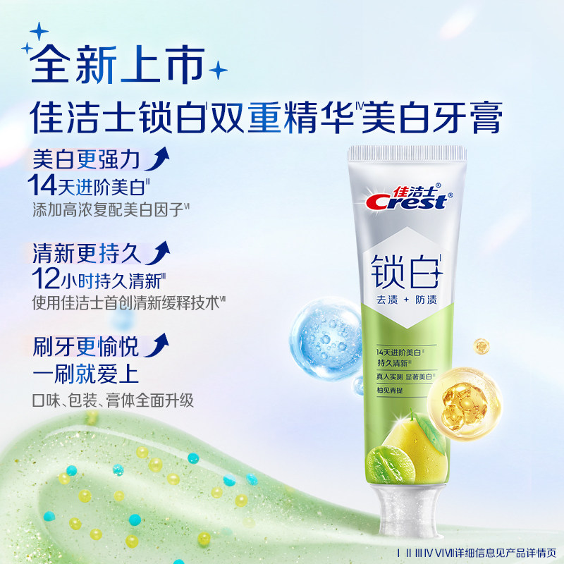 【清新美白】佳洁士锁白双重精华牙膏,专为成人设计,融合双重美白精华,深层清洁牙渍,有效焕亮牙齿自然光泽。独特锁白科技,在清洁的同时形成保护层,帮助抵御日常色素沉积,持久维持牙齿亮白。蕴含清新薄荷成分,带来持久清爽口感,有效抑制口腔细菌,减少口气产生,令呼吸清新自信。膏体细腻温和,不伤牙釉质,适合每日使用。经临床验证,持续使用可见牙齿更洁净、更亮白。正品保障,品质信赖,是追求健康美白笑容的理想选择。每天早晚刷牙两分钟,轻松开启清新自信每一天。