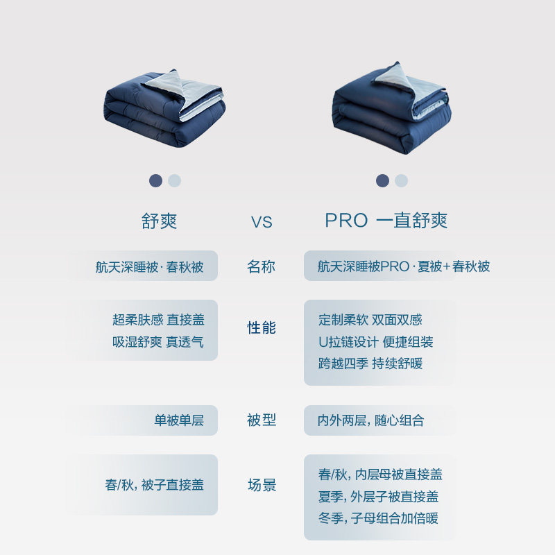 罗莱家纺航天深睡被子是一款专为追求高品质睡眠人群设计的四季通用被芯。采用航天级科技纤维填充,轻盈保暖,透气排湿,有效提升睡眠舒适度。创新免套设计,可直接机洗,省时省力,洁净更便捷。子母被结构灵活组合,春秋单用、冬季叠加,满足不同季节需求。尺寸适中,特别适合学生宿舍、小户型家庭使用。面料亲肤柔软,抗菌防螨,呵护健康睡眠环境。罗莱品牌匠心品质,融合科技与舒适,让每一晚都如置身云端,尽享深睡好梦。无论是自用还是馈赠,都是提升生活品质的贴心之选。
