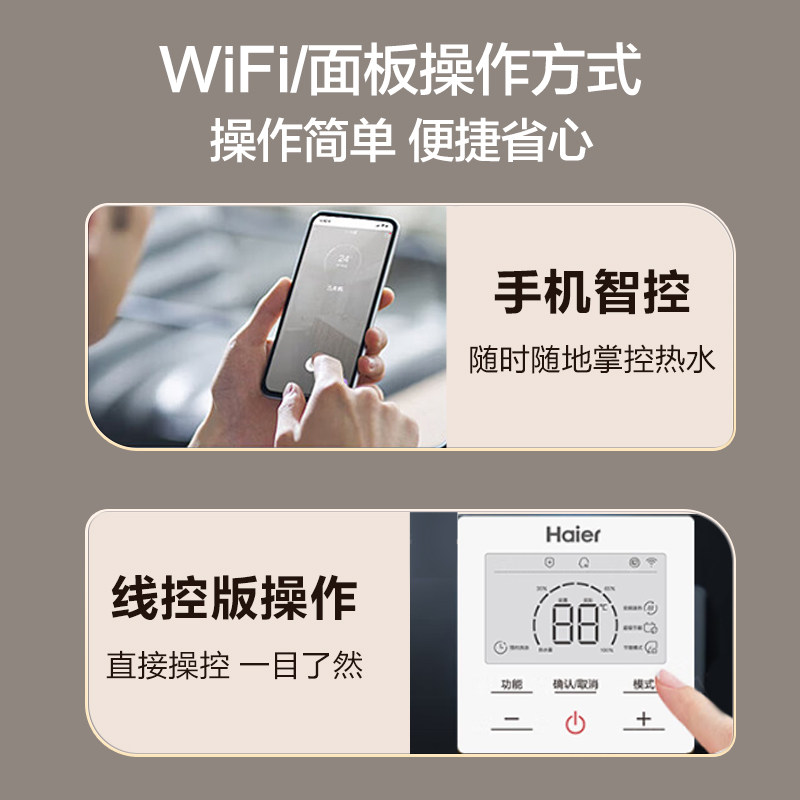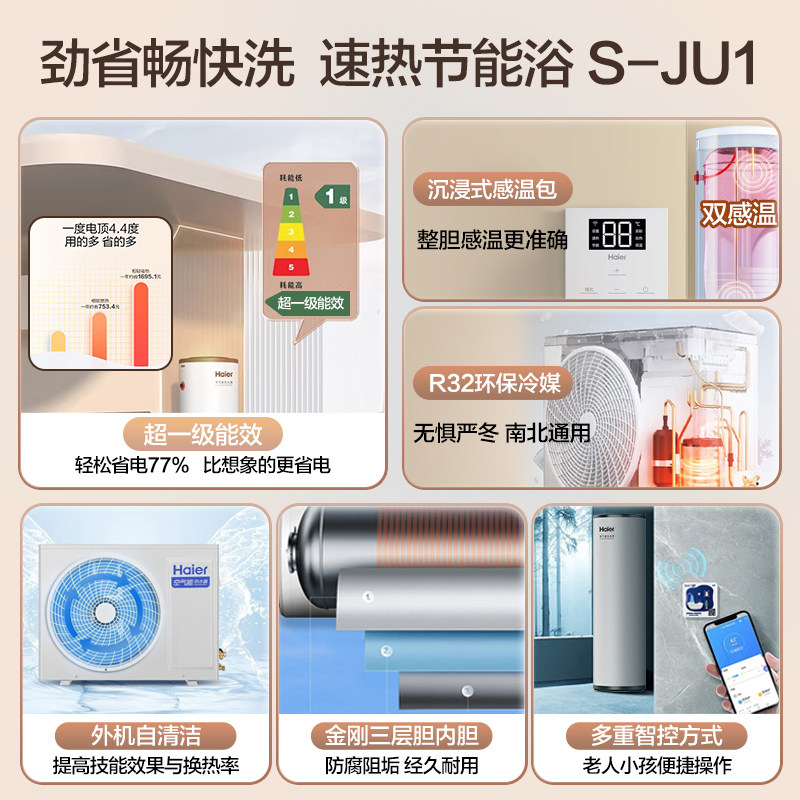 海尔空气能热水器采用先进热泵技术,节能高效,达到国家一级能效标准。200L大容量设计,满足全家日常洗浴需求,双变频系统智能调节压缩机与风机转速,运行更平稳、节能且静音。支持150L与300L多种容量选择,适配不同家庭用水场景。利用空气中免费热能加热,比传统电热水器省电高达75%,环保又经济。搭载智能控制系统,支持预约加热、远程操控,使用便捷。防腐内胆与多重安全保护设计,确保长久耐用与安全运行。无论是高层住宅还是别墅,海尔空气能热水器都是绿色家居的理想选择,兼顾舒适体验与节能理念。