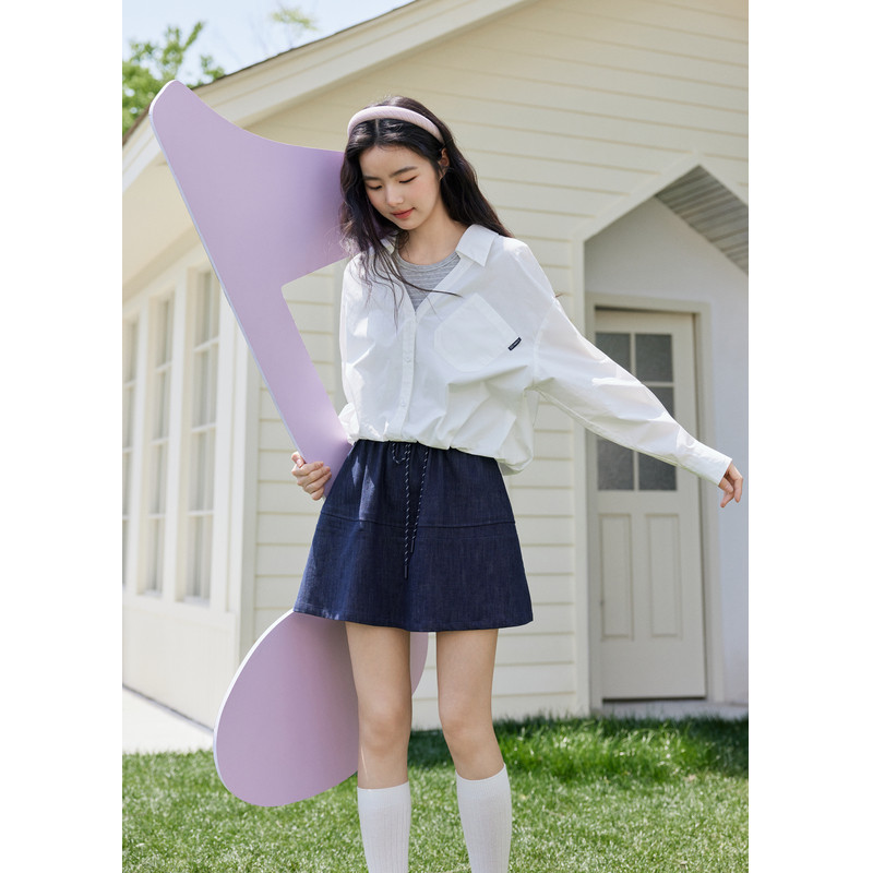 天ONLY2026春季新款轻薄透感抽绳下摆宽松落肩翻领长袖衬衫上衣女