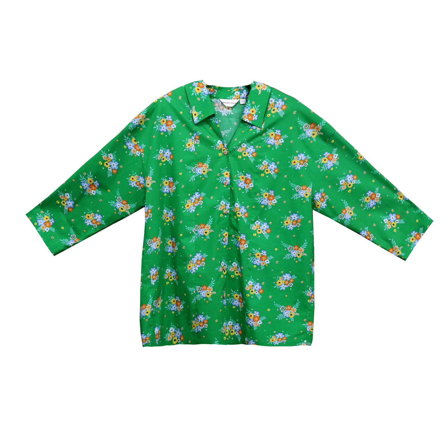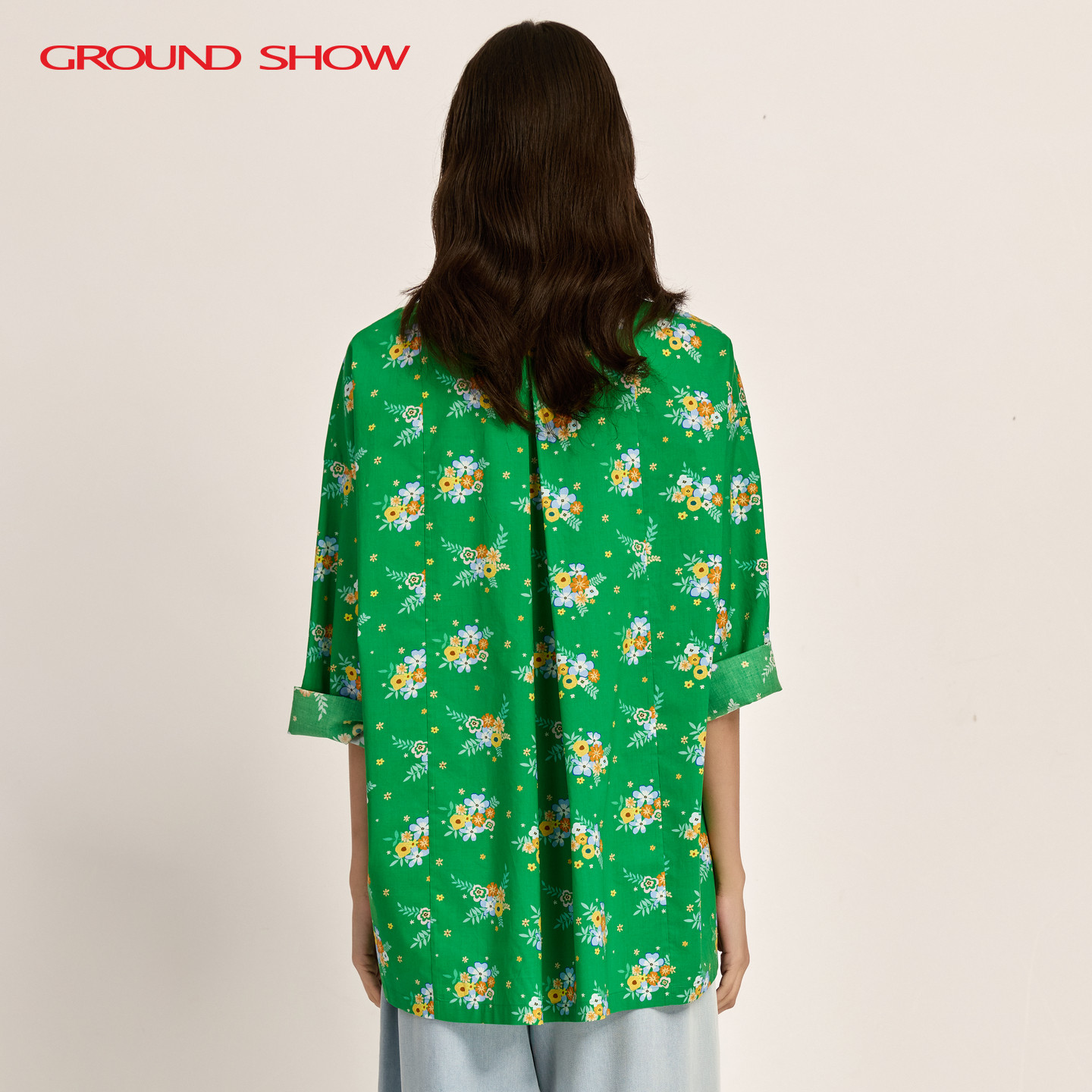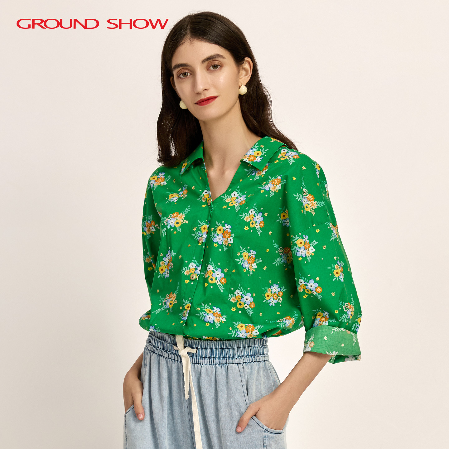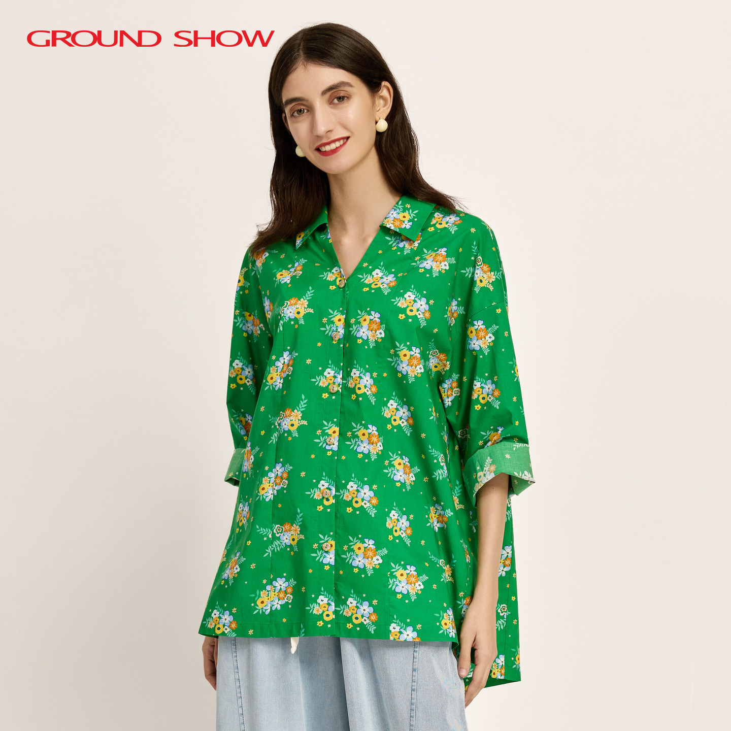 天猫阁兰秀2026春季新品鲜绿色落肩袖全棉印花慵懒松弛感宽松衬衫女装