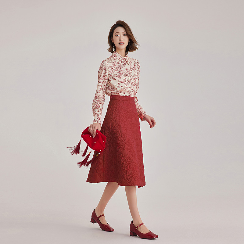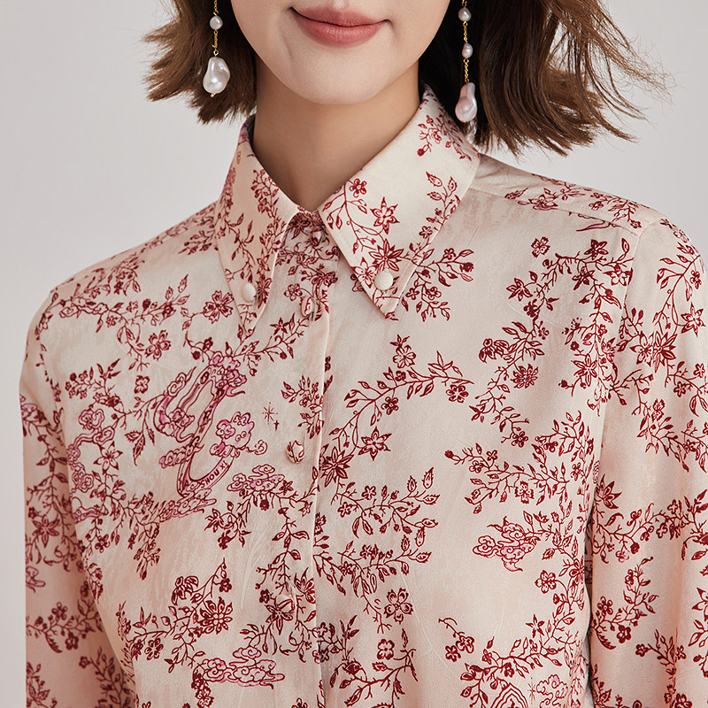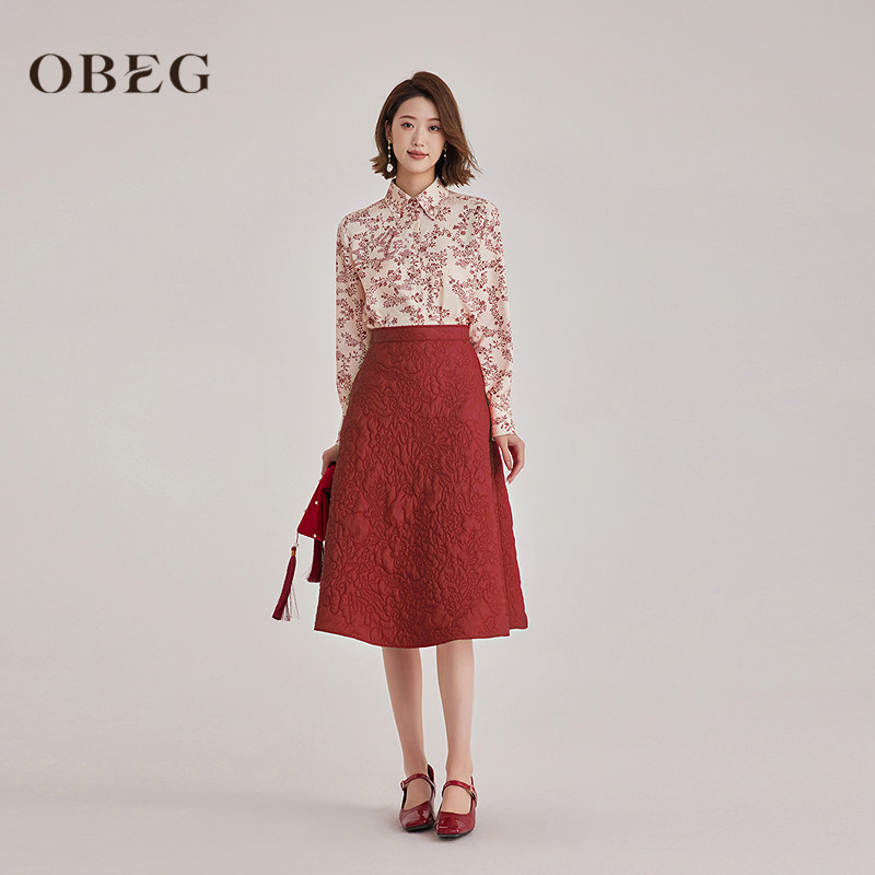 天猫OBEG欧碧轻中式绛红印花长袖衬衫女春款复古暗纹气质上衣10501011