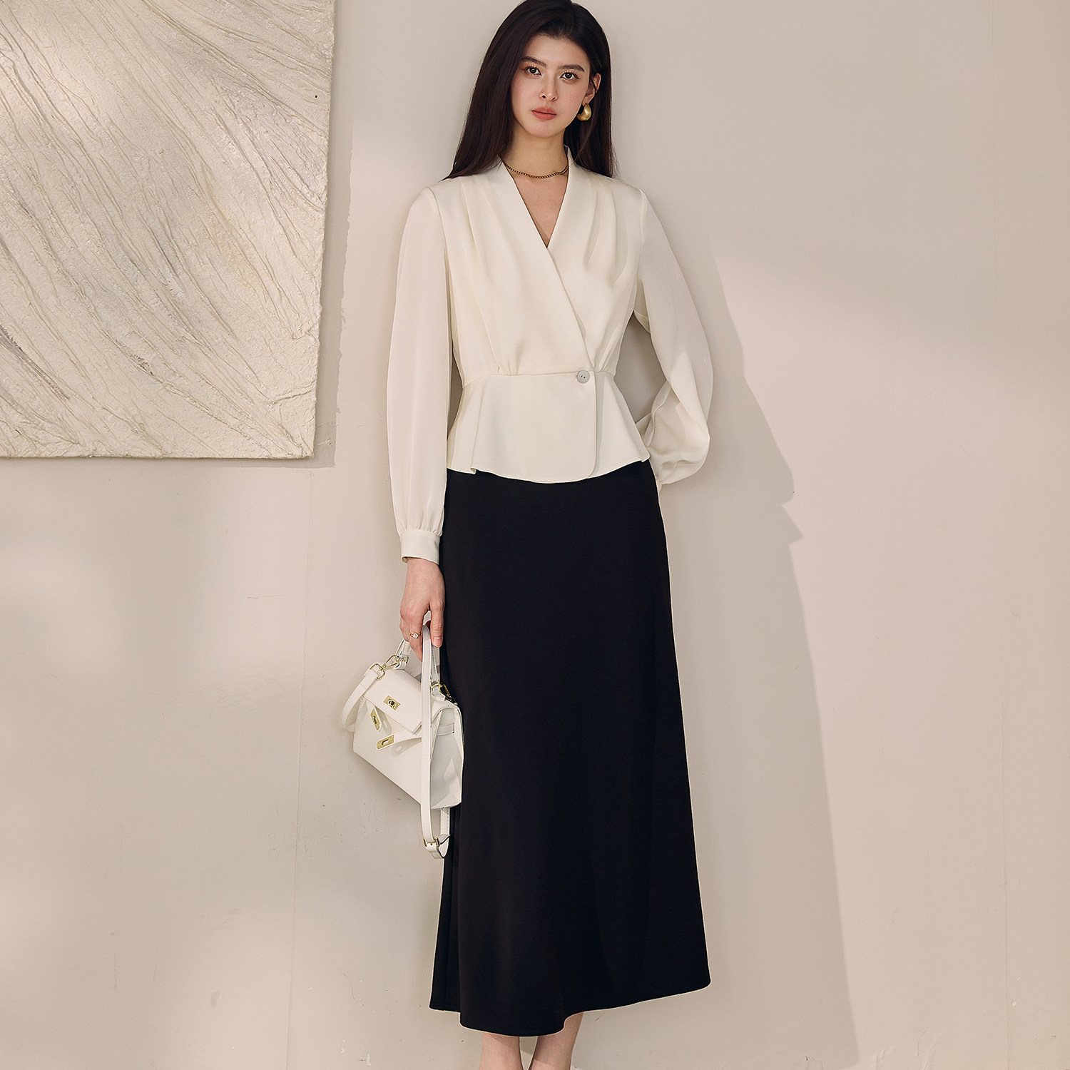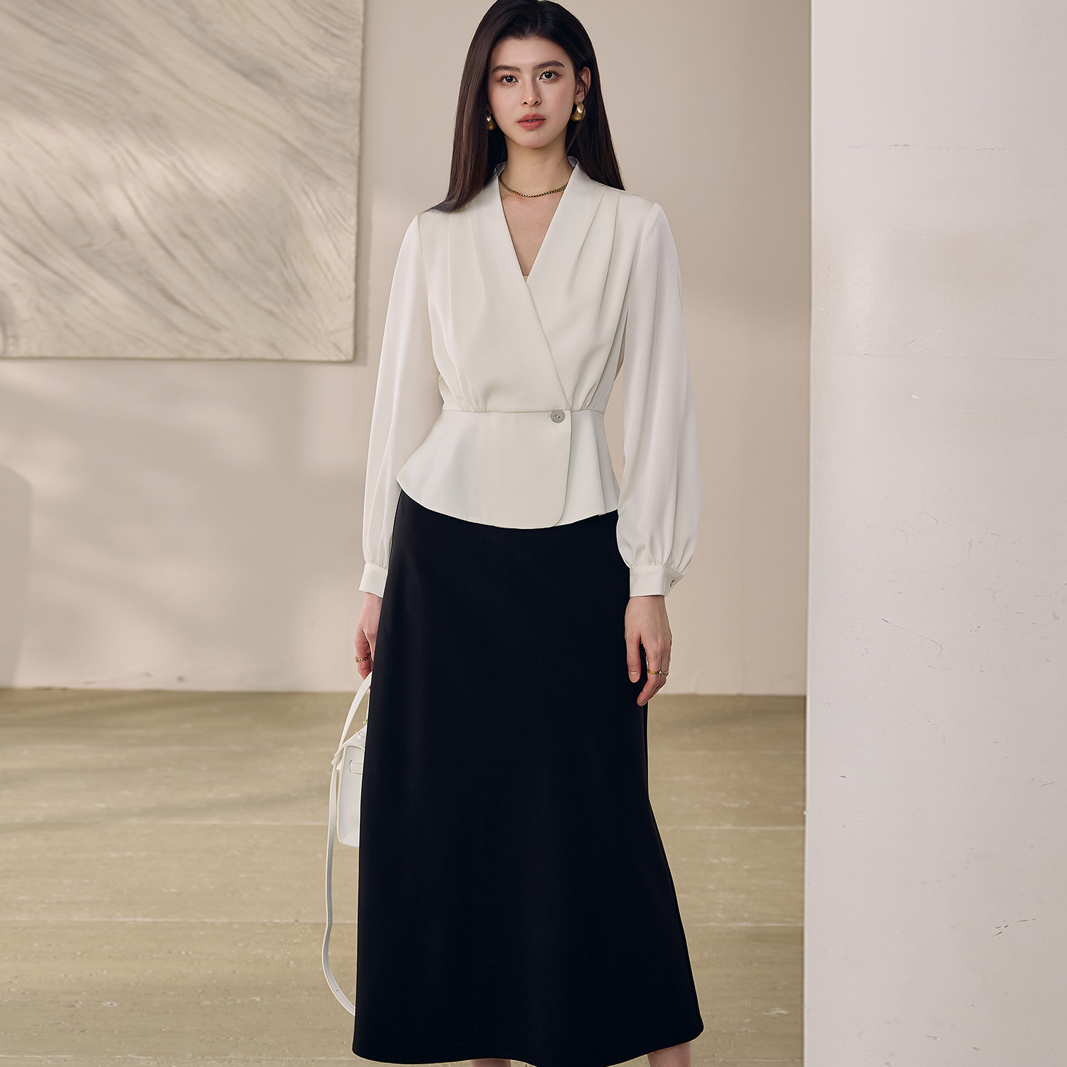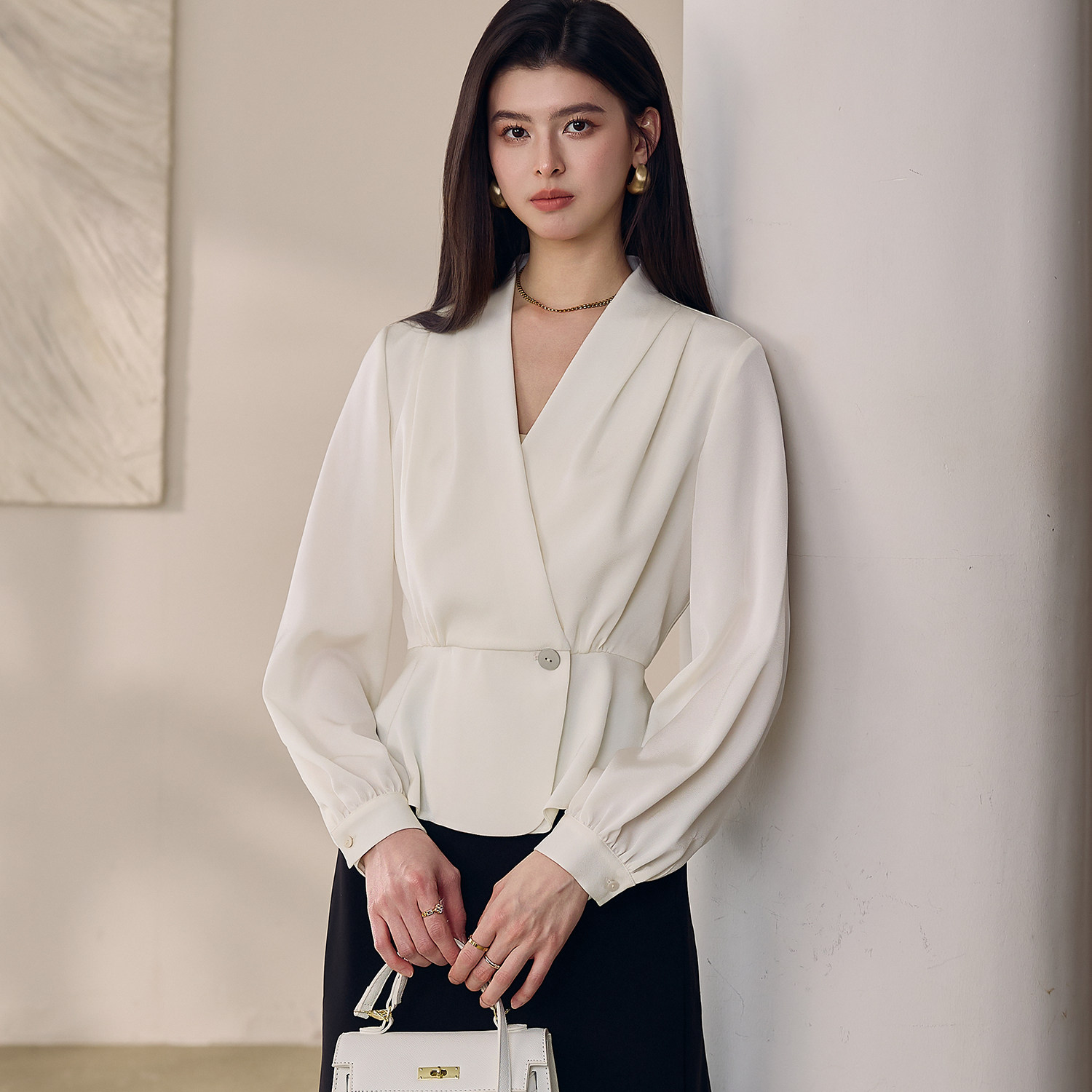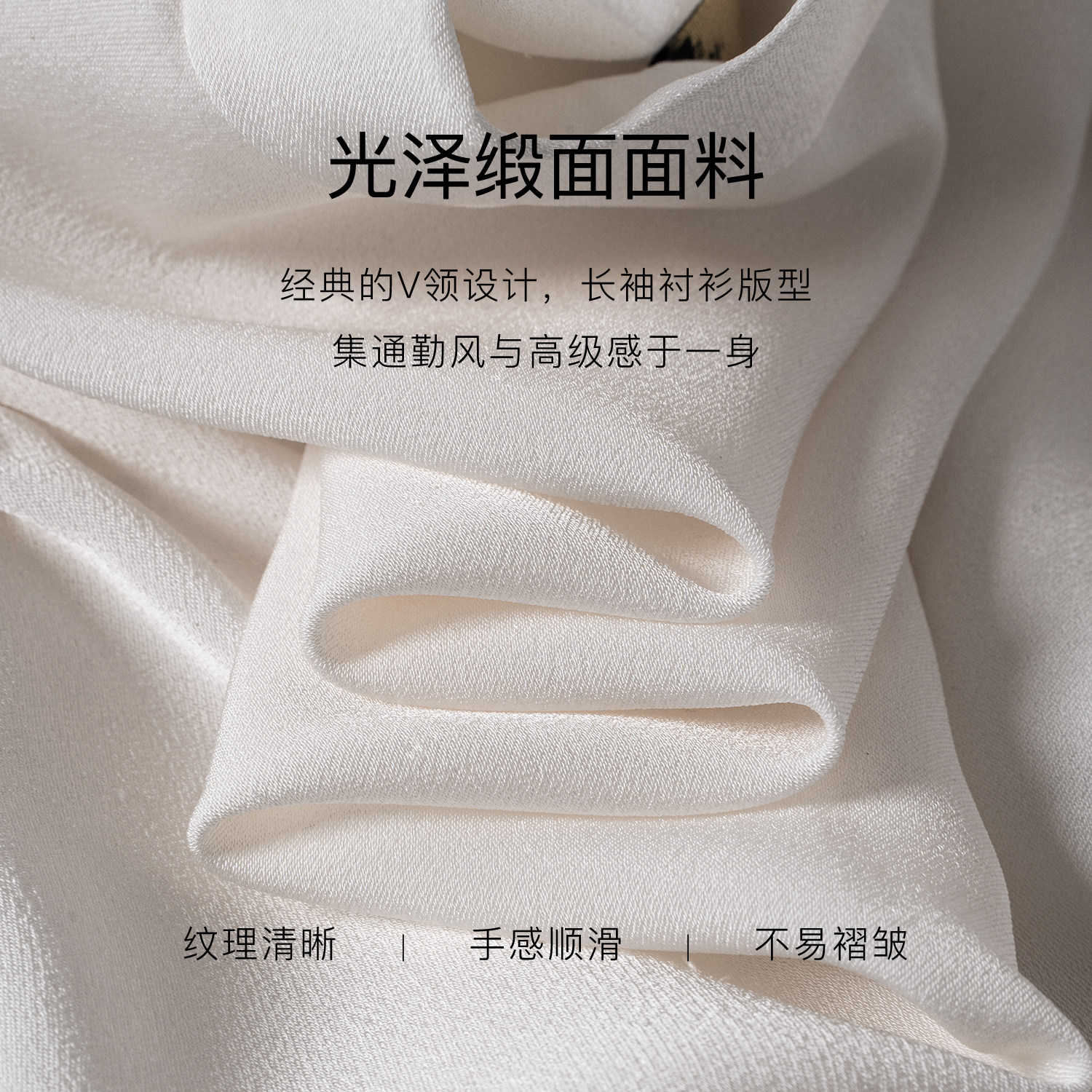 天猫罗衣轻奢高级感V领收腰缎面长袖衬衫女春职场通勤米白短上衣13331