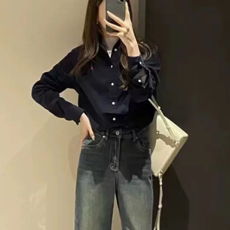 Halo Luu蓝色衬衫女春季新款韩系休闲纯棉宽松慵懒风外套长袖衬衣