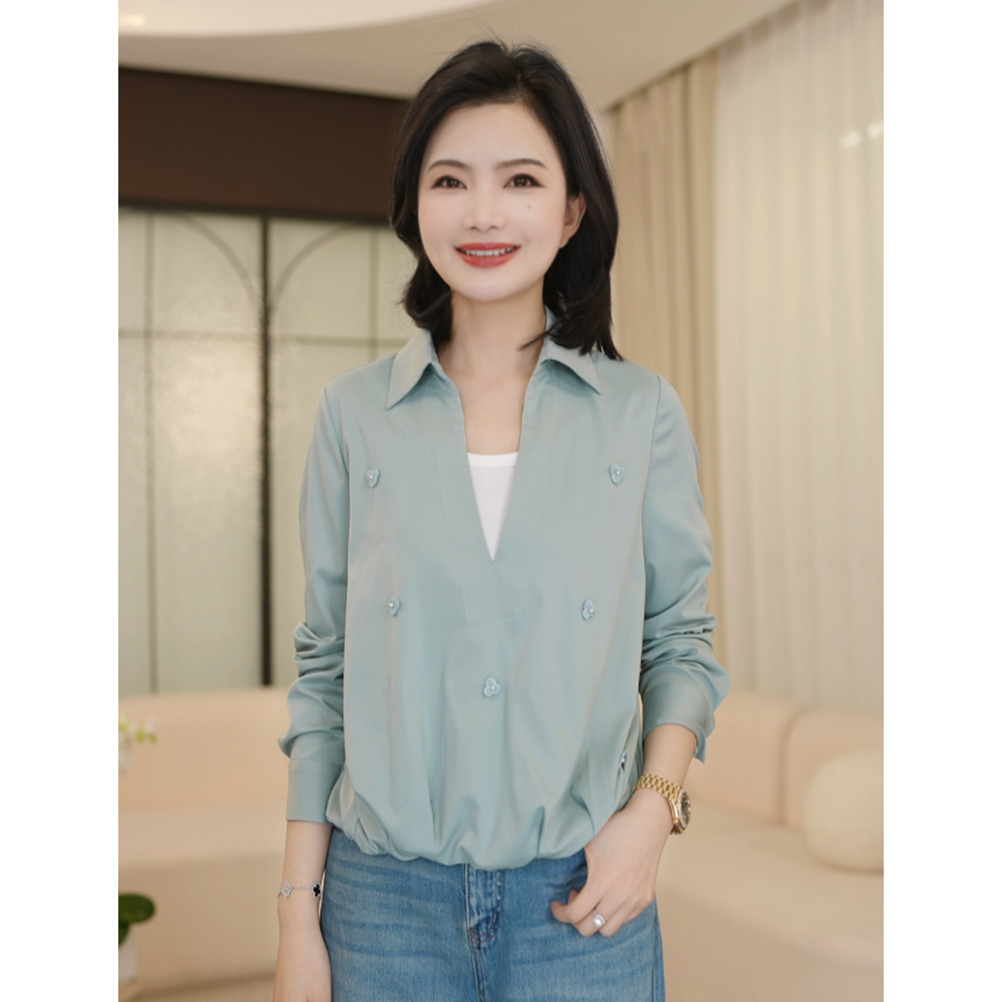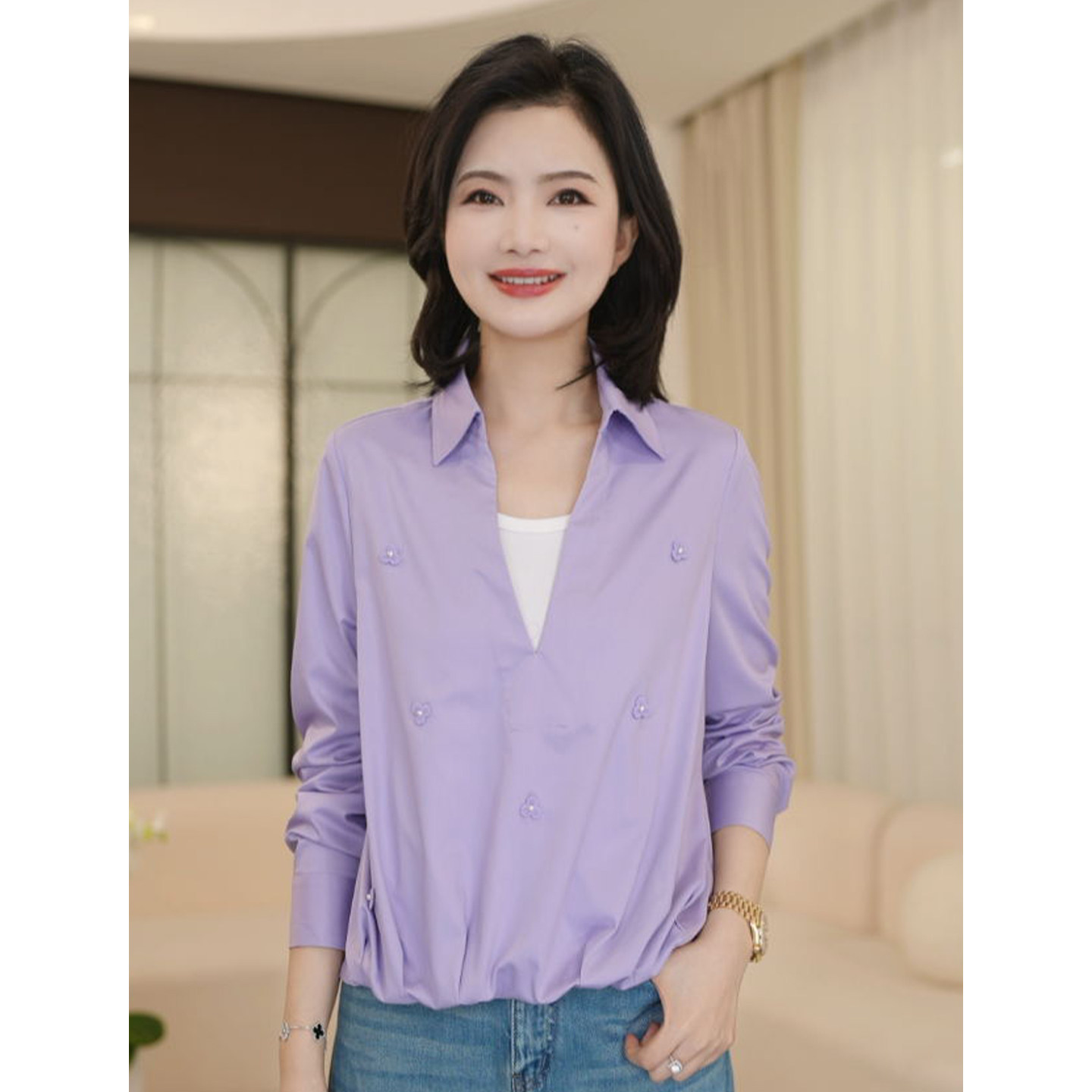 枫竺2026春季新款女士衬衫,以知性简约风格诠释现代女性优雅气质。采用翻领与V领假两件设计,层次分明,视觉丰富而不繁复。衣身点缀精致钉珠与立体花朵装饰,细节考究,增添柔美浪漫气息。长袖剪裁合体,面料轻盈垂顺,兼顾舒适与挺括感。整体设计融合经典与时尚,既适合职场通勤,亦可搭配休闲场合,展现从容自信的穿搭态度。枫竺以匠心工艺打造这款兼具美感与实穿性的衬衣,为春日衣橱注入一抹清新雅致的知性风采。