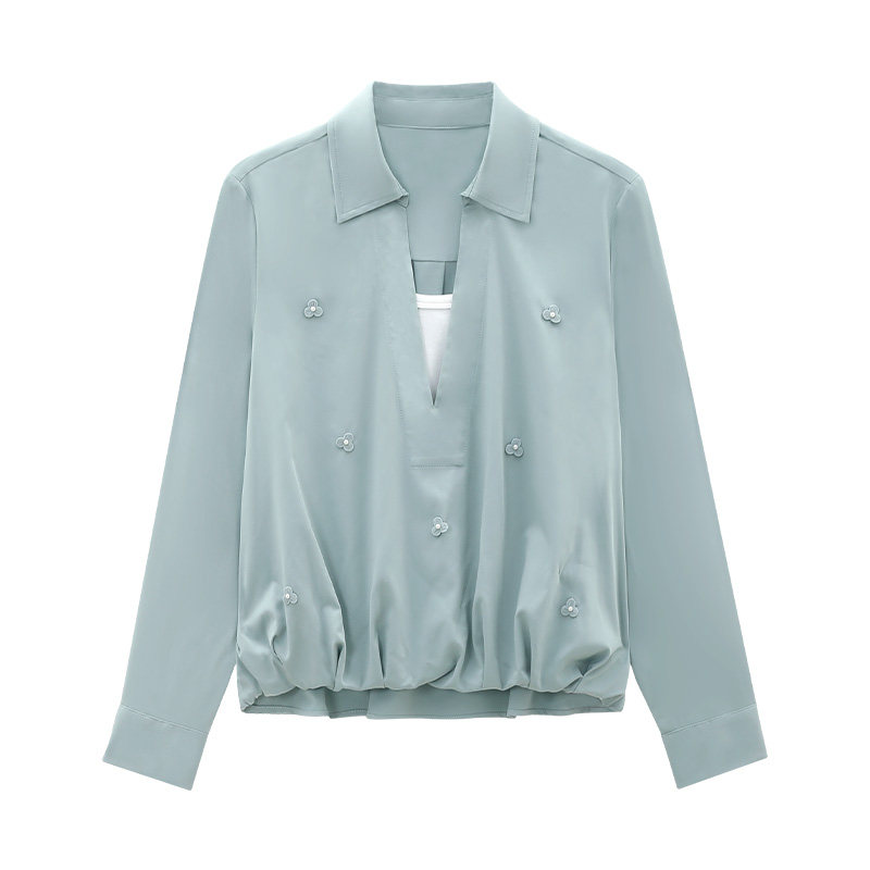 天猫枫竺翻领V领钉珠立体花长袖假两件衬衫女2026春季知性风简约衬衣