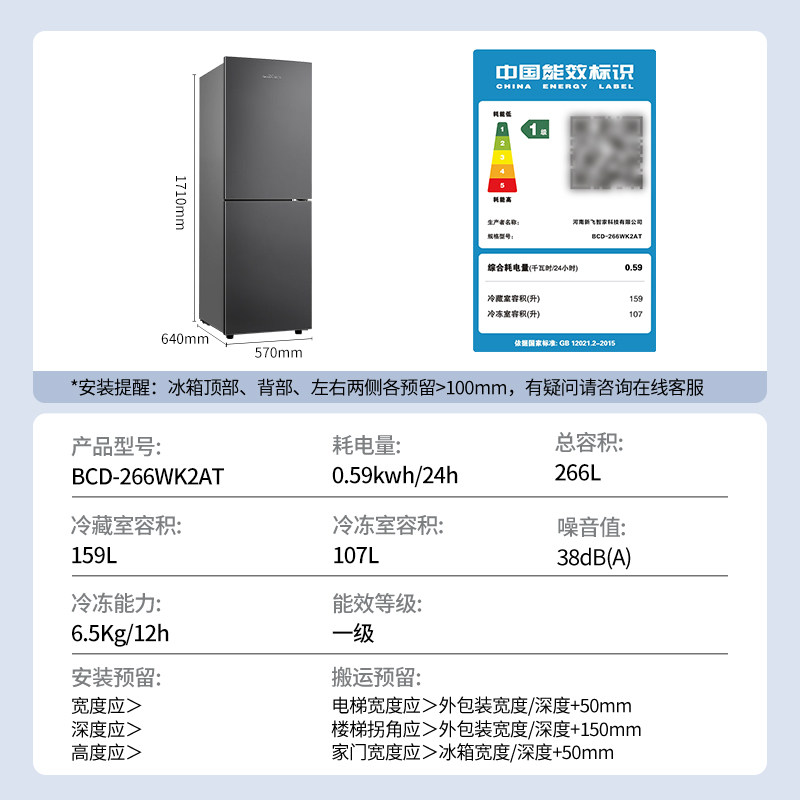 天猫新飞266L升风冷无霜一级能效家用节能省电冷藏冷冻大容量两门冰箱