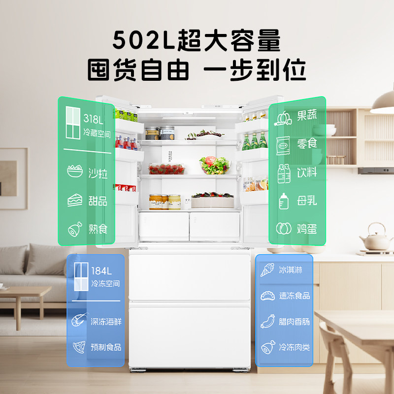 海尔冰箱统帅502L升超薄大容量法式多开门双系统无霜家用电冰箱,集大容量与精致设计于一体。502升超大空间,满足多口之家储鲜需求,法式多门布局合理分区,冷藏、冷冻独立调控。采用双系统制冷技术,冷藏冷冻互不干扰,避免串味,保鲜更持久。风冷无霜设计,告别手动除霜烦恼,食材长久水润。机身纤薄,轻松嵌入橱柜,节省厨房空间。智能温控系统精准调节,节能静音运行,兼顾环保与实用。统帅系列以高性价比著称,是追求品质生活的家庭理想之选,让新鲜触手可及。