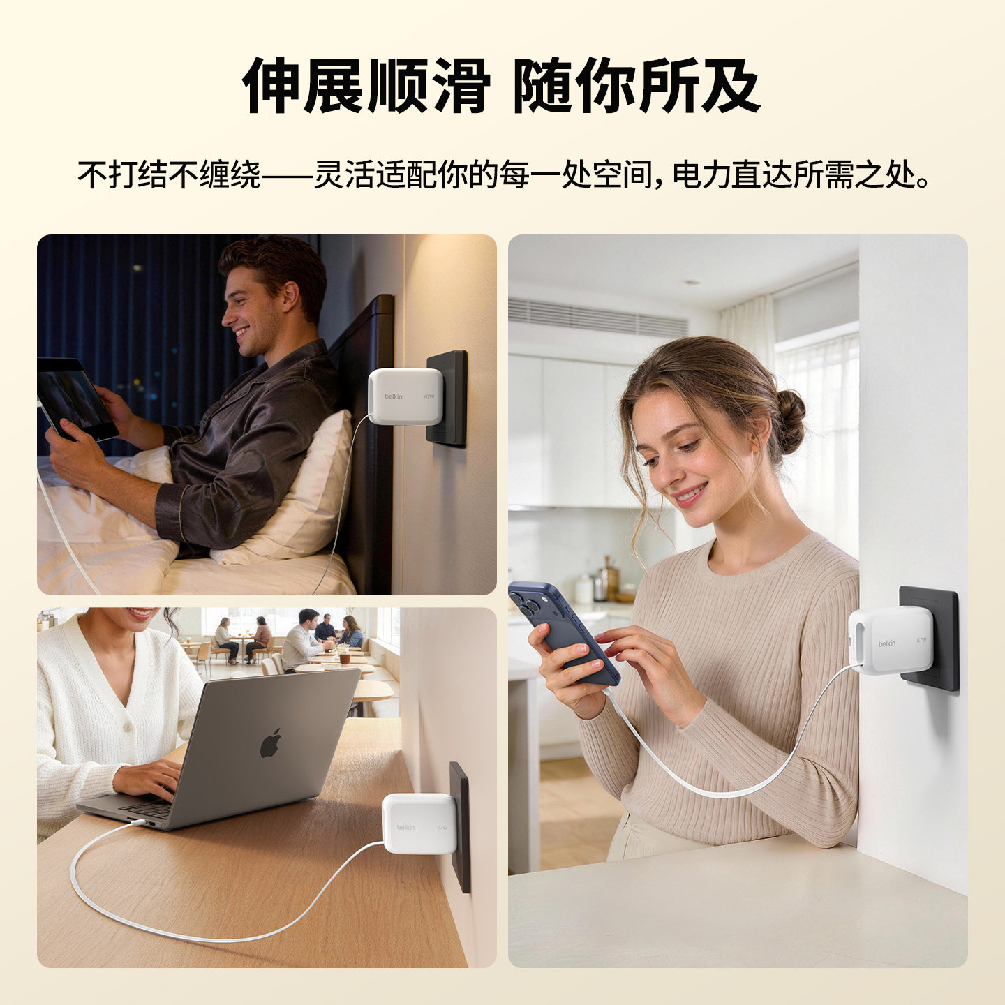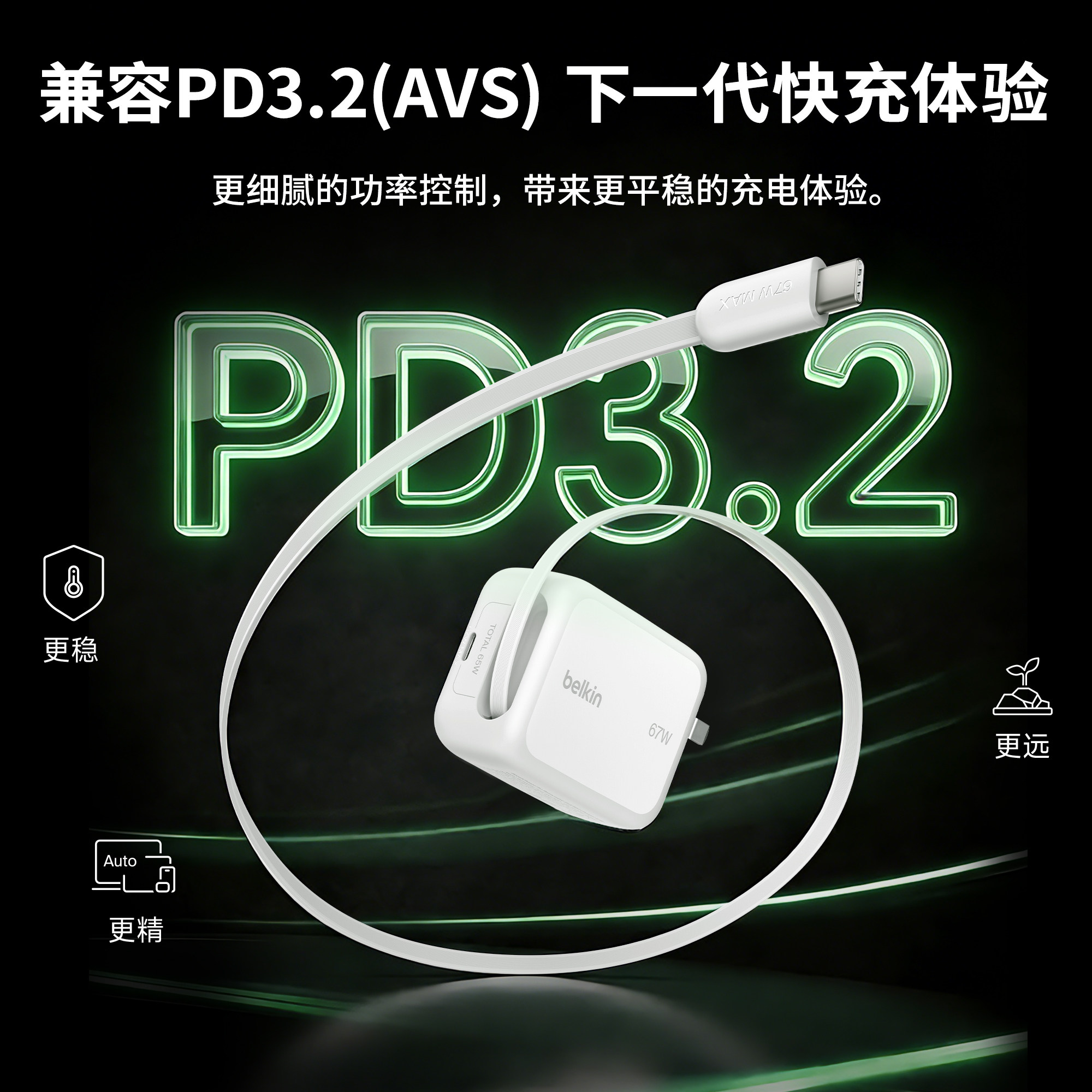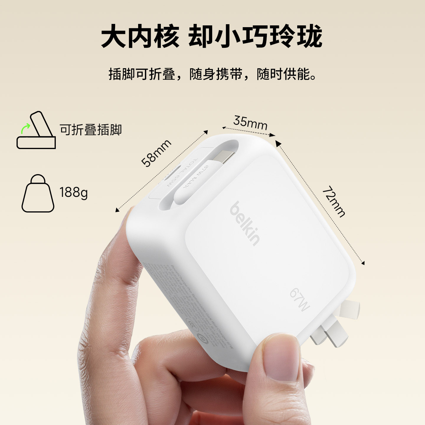 Belkin贝尔金67w自带伸缩线TypeC充电器氮化镓充电头AVS快充适用苹果iPhone17ProMax手机笔记本电脑平板iPad