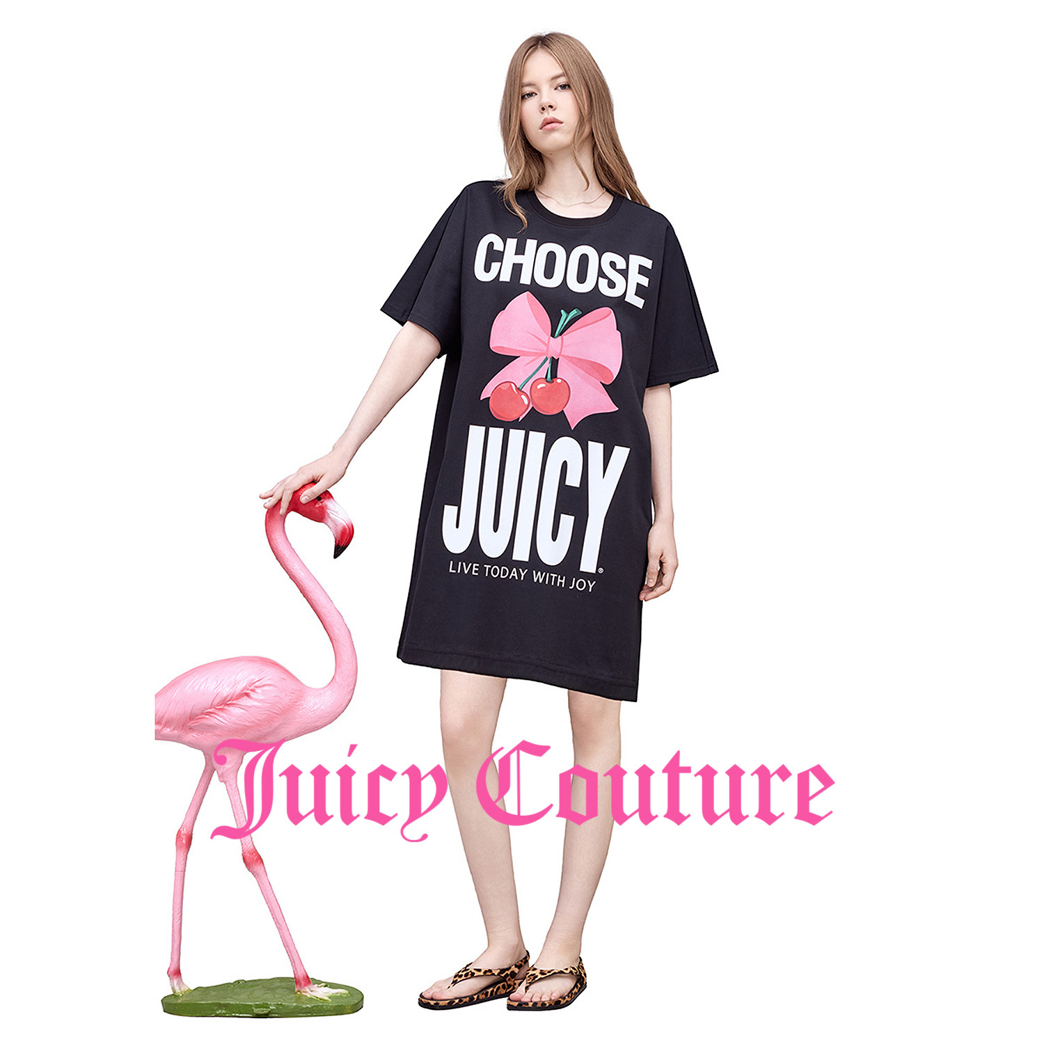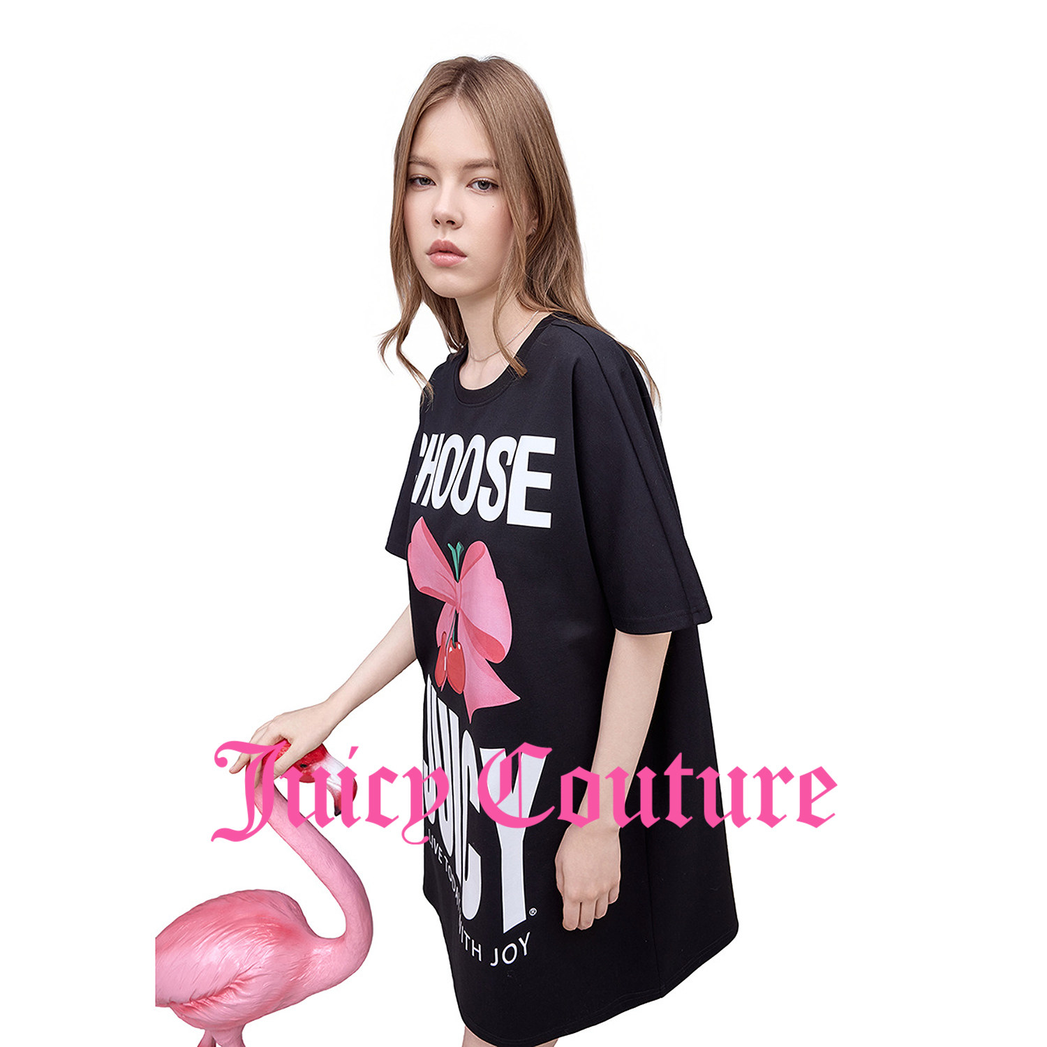 天猫Juicy Couture橘滋连衣裙女26夏季新款黑色印花直筒连肩袖T恤短裙