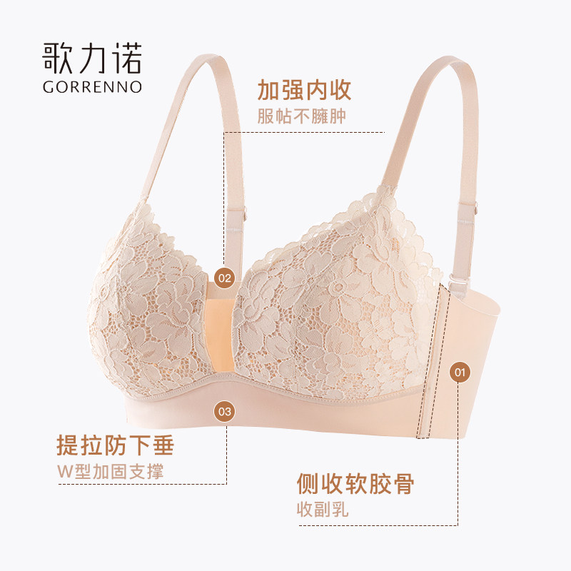 歌力诺内衣女薄款钢圈大胸显小聚拢性感蕾丝收副乳防下垂文胸套装