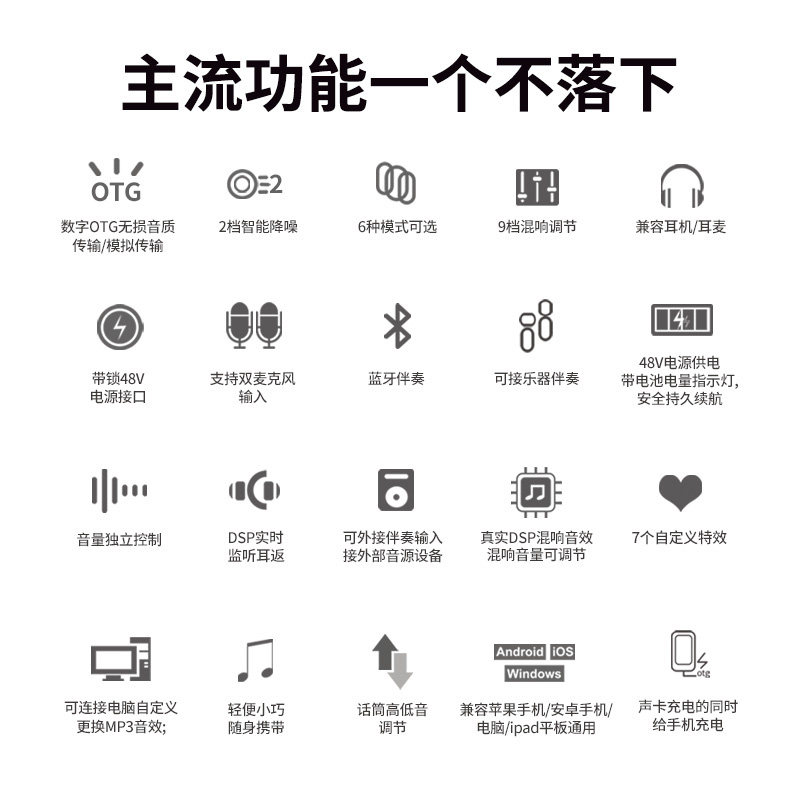 ickbDBS一代手机声卡唱歌直播专用麦克风话筒主播录音全套装设备,专为手机直播、K歌、录音打造,集成专业声卡与高品质电容麦克风于一体。支持即插即用,兼容iOS与安卓系统,内置多种音效模式(如混响、变声、降噪),轻松调节音色,提升直播氛围。配备监听耳机接口,实时监听声音效果,确保音质清晰无延迟。全金属机身设计,坚固耐用,附带防喷罩与支架,使用更便捷。无论是户外直播、室内K歌还是专业录音,ickbDBS都能提供稳定出色的音频表现,是主播、歌手及内容创作者的得力助手,让每一次发声都更动听。