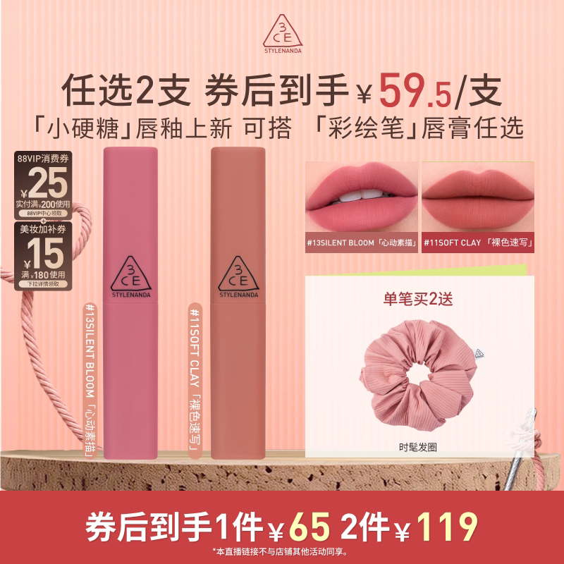 天猫【达人直播】3CE小硬糖唇釉彩绘笔唇膏水光镜面裸色唇颊多用 NHO