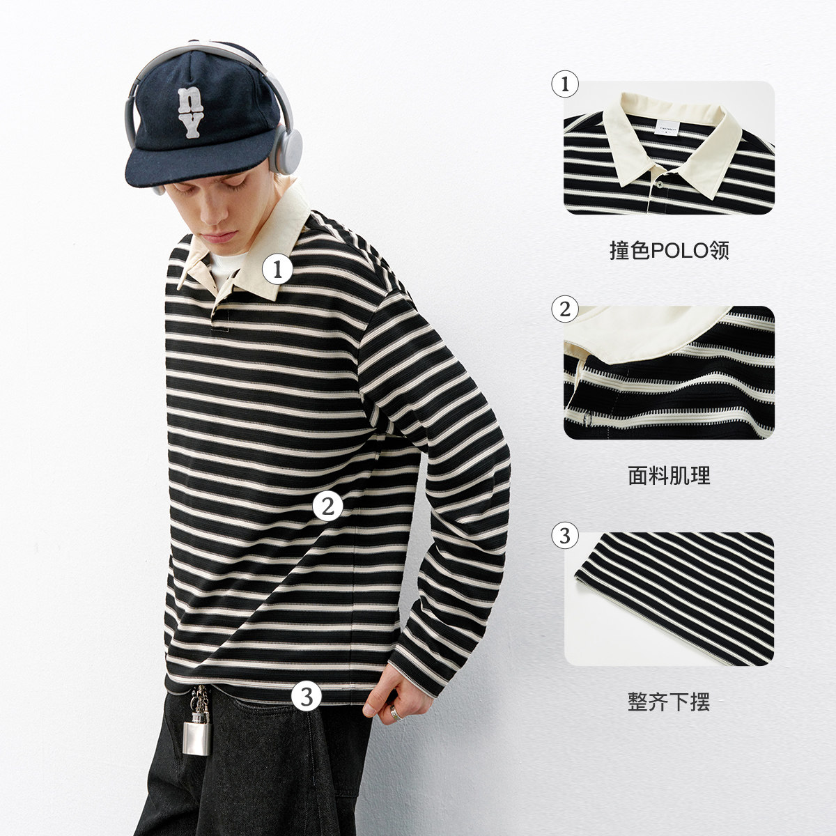 714street条纹提花肌感针织长袖T恤,2026春季复古Polo衫,男女同款设计,融合经典与潮流。采用高品质肌感针织面料,触感柔软、透气亲肤,贴身穿着舒适自在。胸前精致提花条纹装饰,细节考究,复古韵味十足,轻松打造都市休闲风格。合身剪裁兼顾挺括与弹性,袖口与下摆微收设计,凸显利落线条。无论是单穿还是叠穿,都能展现随性又不失格调的穿搭态度。适合春日通勤、周末出游等多种场合,是追求质感与风格的时尚之选。
