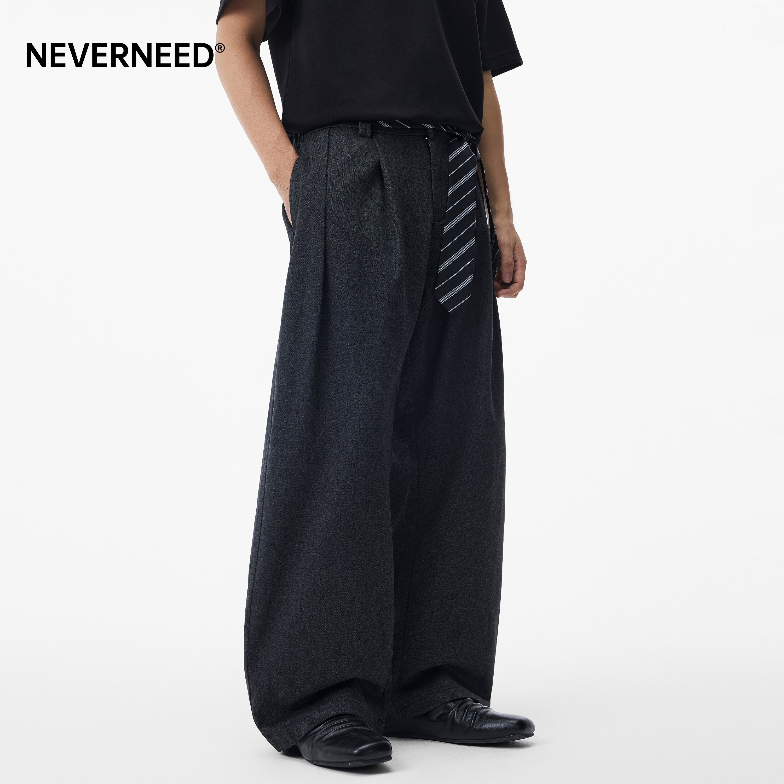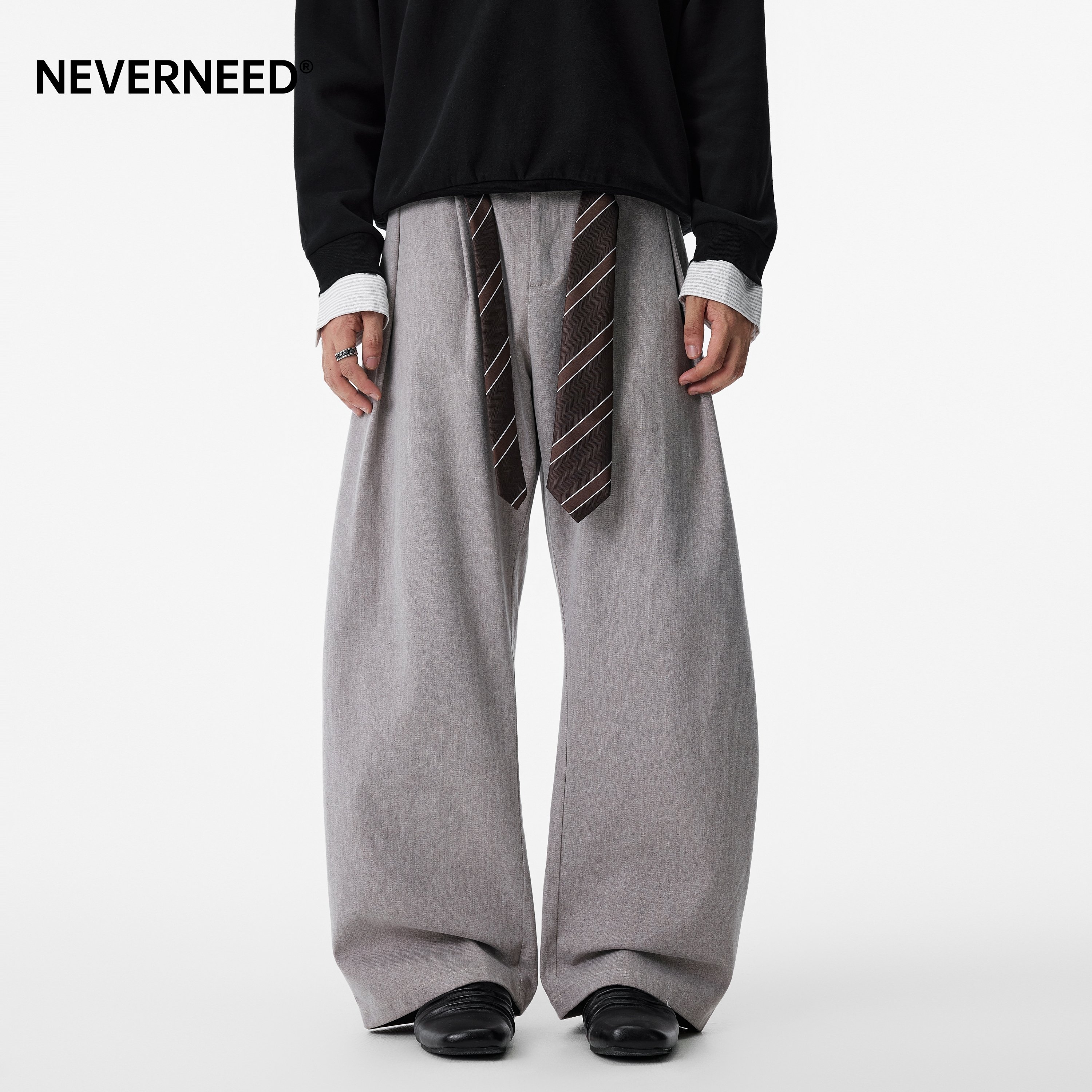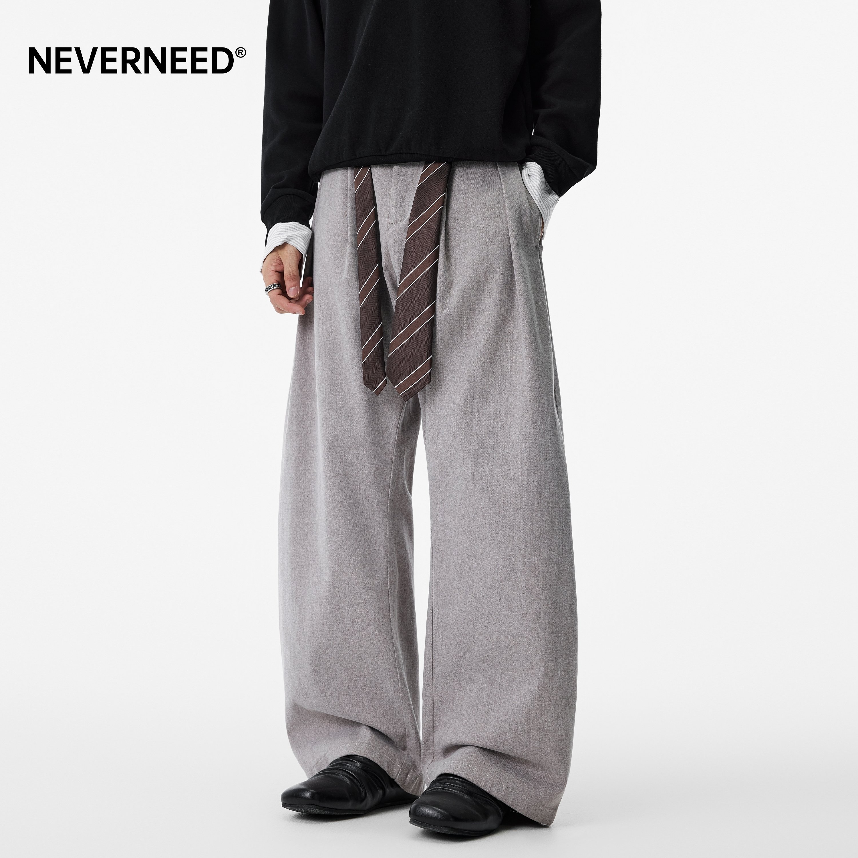 淘宝NEVERNEED纯色毛呢腰带休闲西裤男女秋季美式复古宽松褶皱阔腿裤