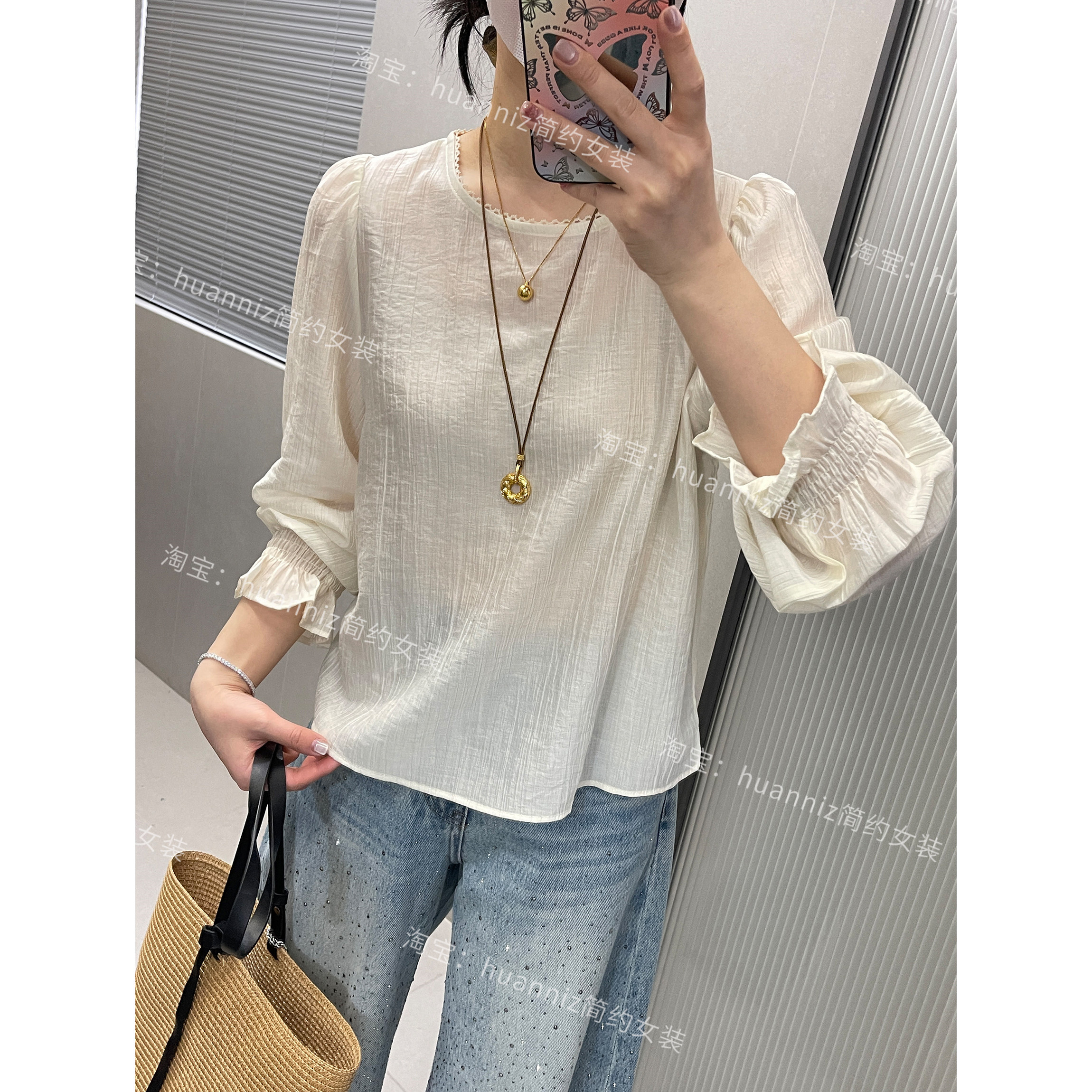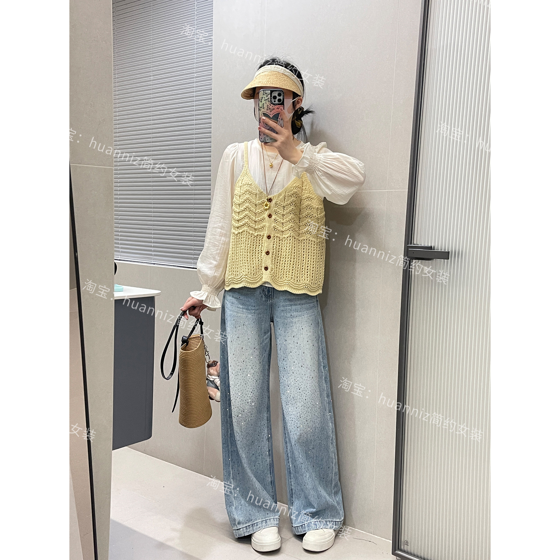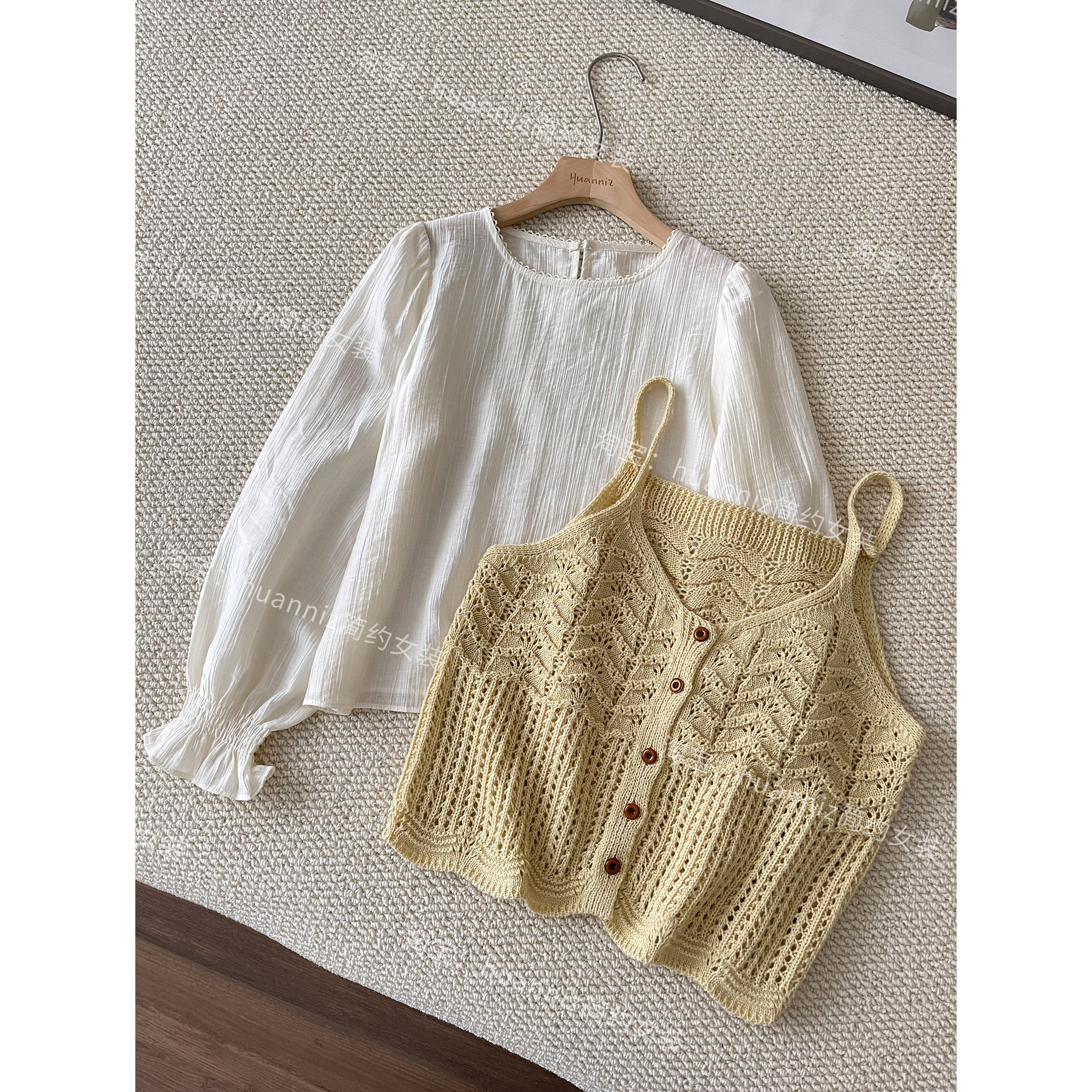 淘宝春季氛围感真两件套钩花镂空针织马甲天丝轻薄花边娃娃衫女套装