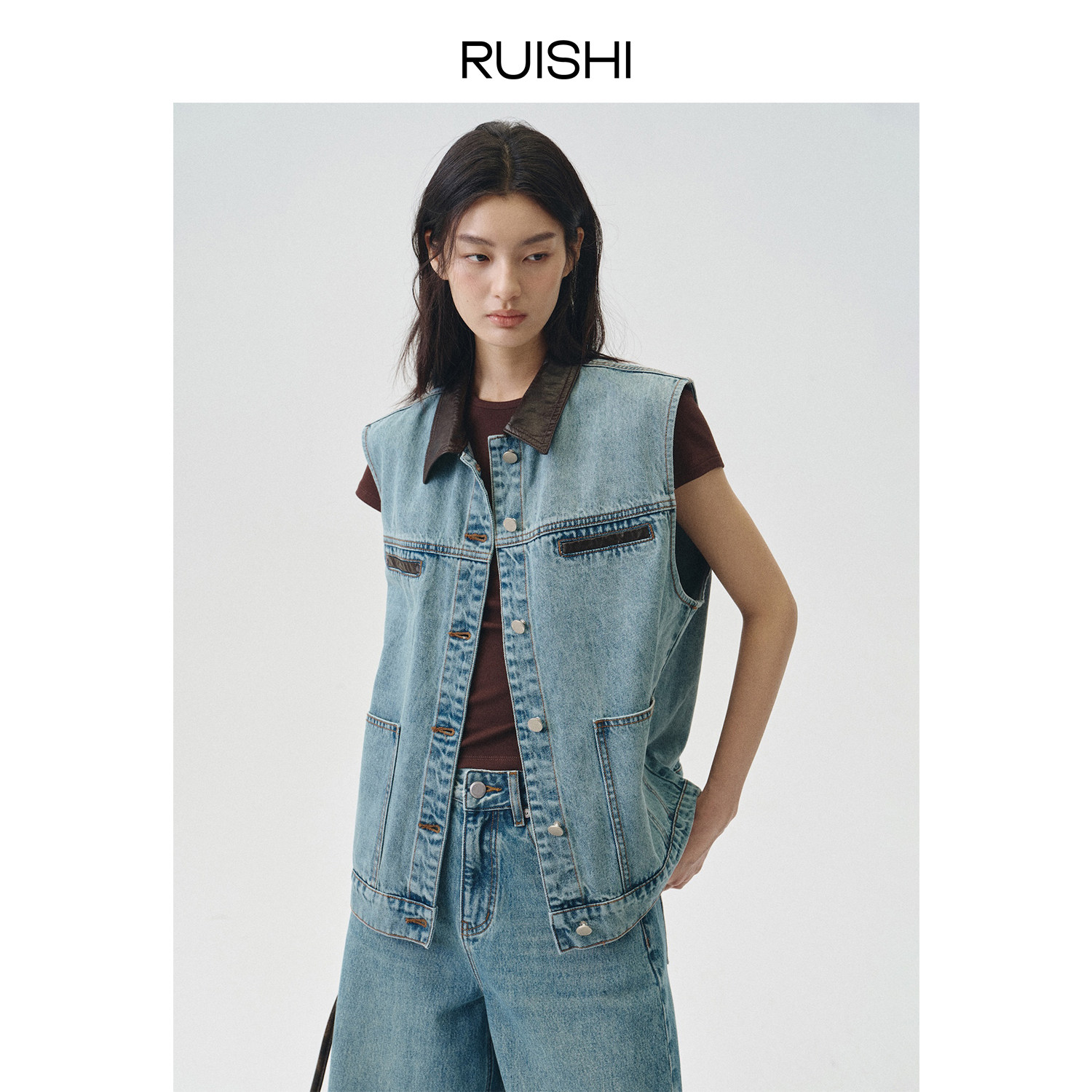 天猫RUISHI芮时“尼斯周末”100棉撞色拼皮慵懒复古休闲牛仔马甲女夏