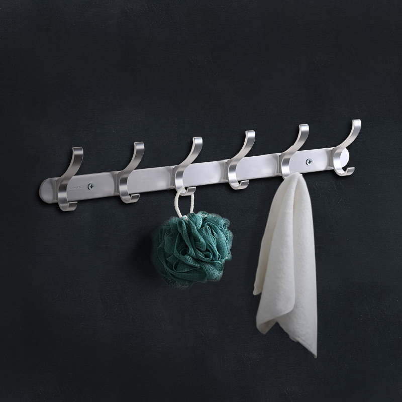 九牧卫浴太空铝衣钩,采用高强度太空铝材质,轻盈坚固、防锈耐腐蚀,适用于潮湿卫浴环境。产品设计简约时尚,表面经精细氧化处理,质感细腻,持久如新。多钩位排布设计,可同时悬挂毛巾、衣物、浴袍等,充分利用墙面空间,提升浴室收纳效率。支持壁挂或门后安装,灵活便捷,不占地面空间。承重能力强,稳固耐用,是现代化卫浴空间的理想五金配件。九牧以匠心工艺打造,兼顾美观与实用,为品质生活提供贴心解决方案。