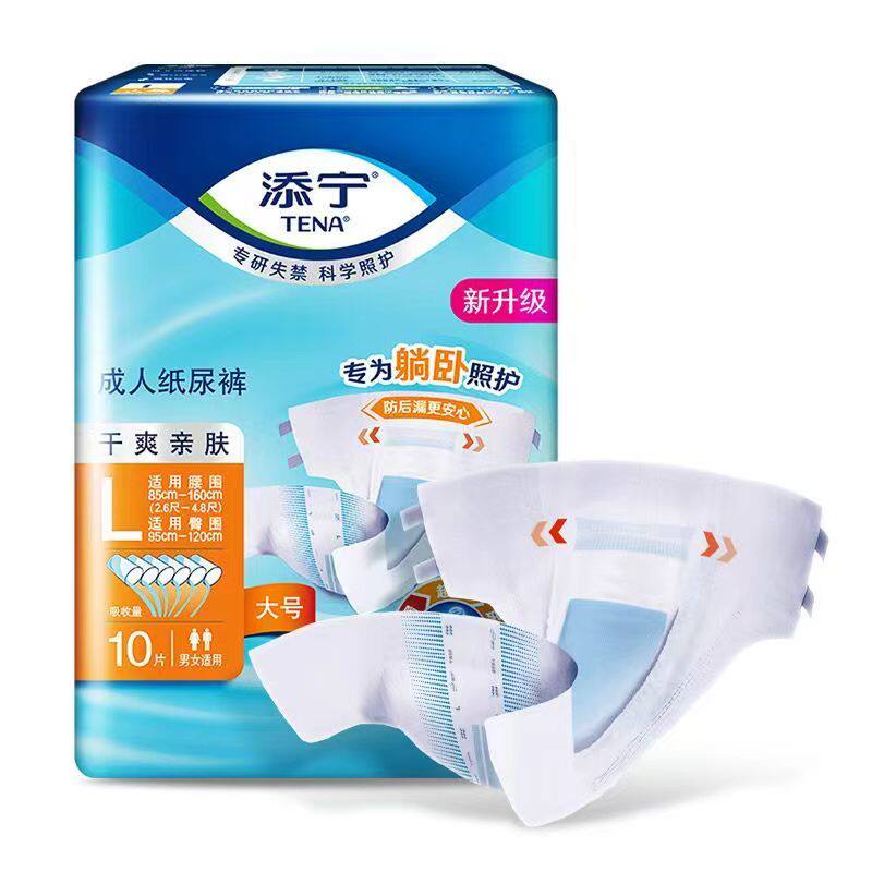 添宁亲肤干爽成人纸尿裤专为老年人、产妇及失禁人群设计,男女通用,采用柔软亲肤表层,减少摩擦不适,提升穿戴舒适度。内层高效吸收芯体迅速锁水,保持表层干爽,有效防止反渗和红疹。立体防漏隔边设计,全方位防侧漏,夜间使用更安心。弹性腰围贴合身形,不勒腰,穿脱便捷。非拉拉裤款式,适合卧床或行动不便者,搭配护理垫使用效果更佳。产品通过安全检测,无刺激,呵护敏感肌肤,是家庭护理的理想选择,让使用者重拾尊严与舒适,照护者更省心省力。