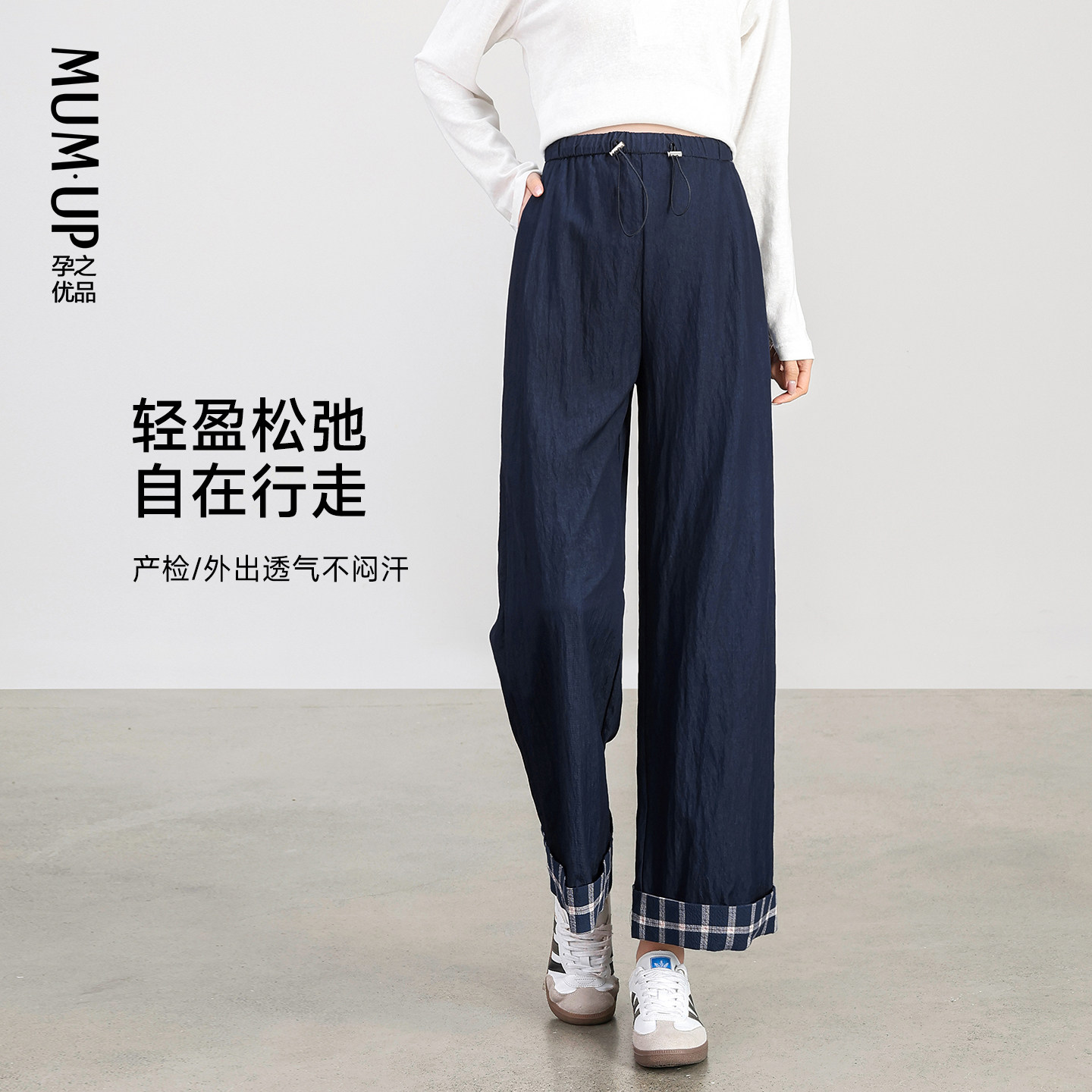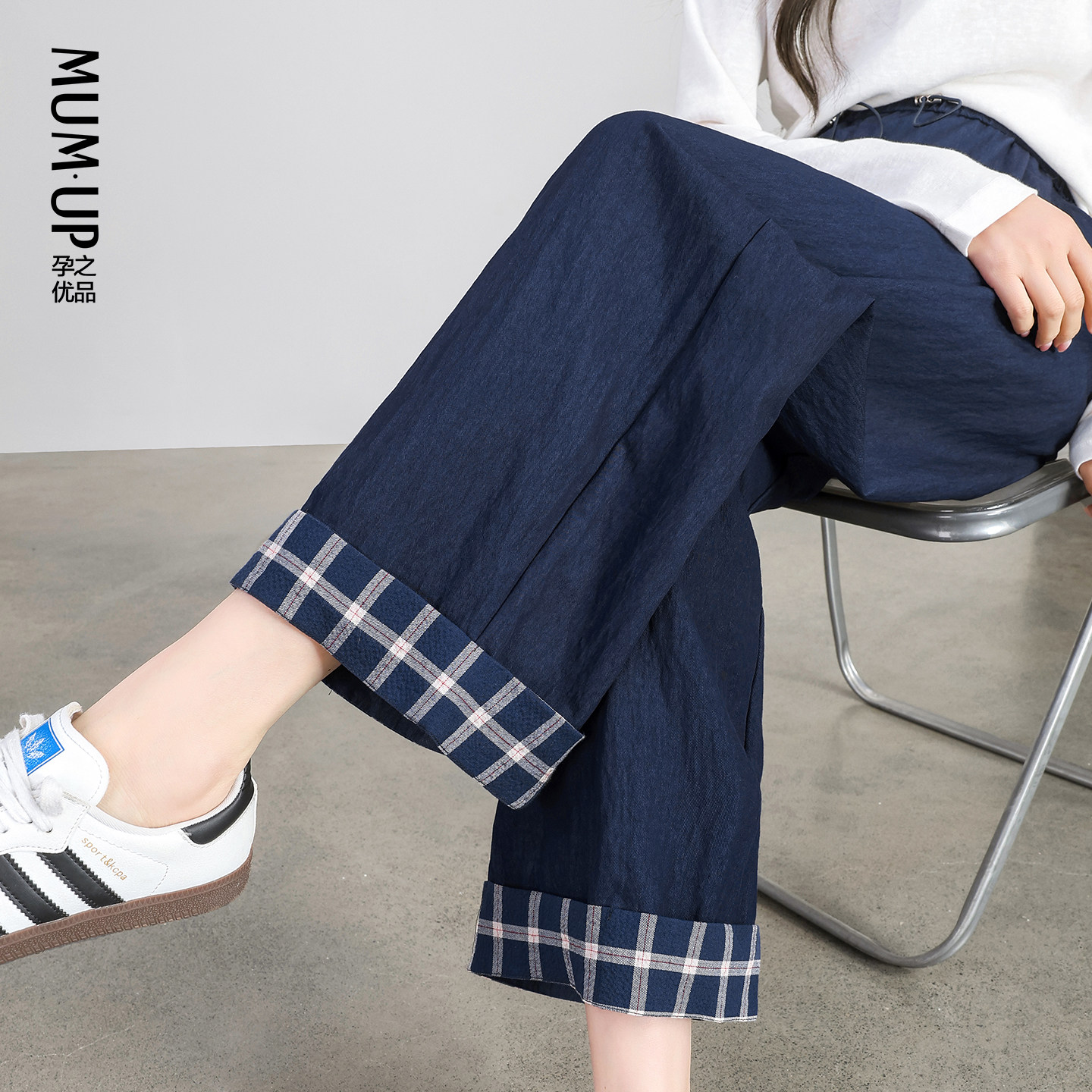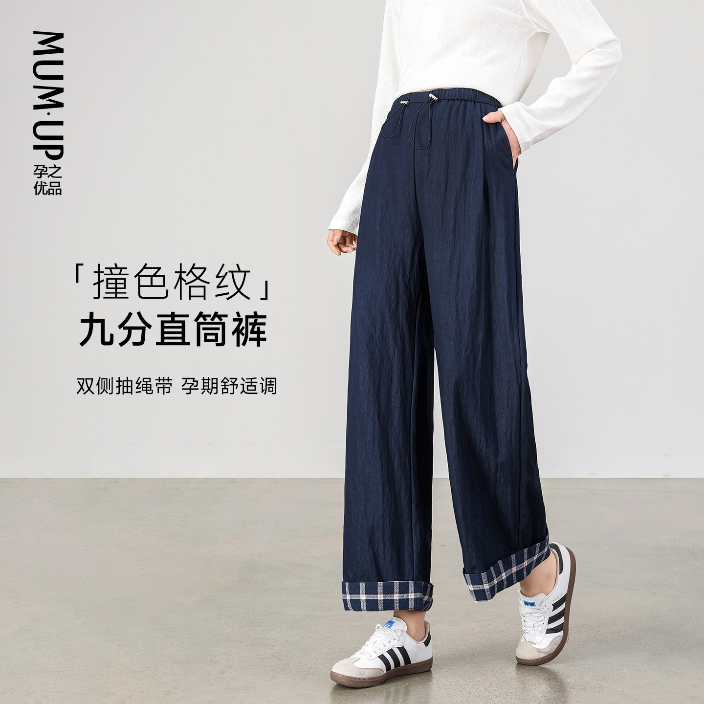 天猫【新品】孕妇撞色格纹直筒裤春夏抽绳九分小个子孕妇阔腿裤孕妇裤