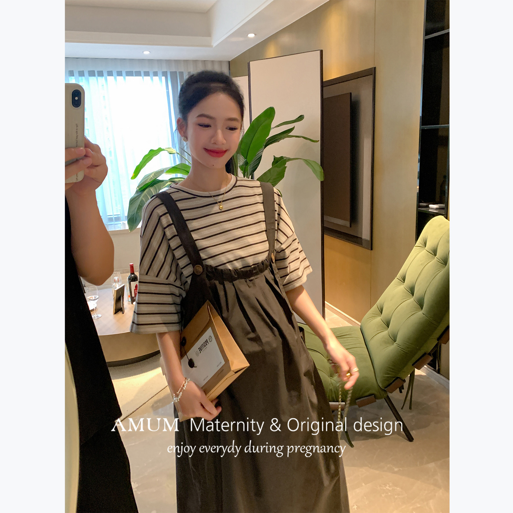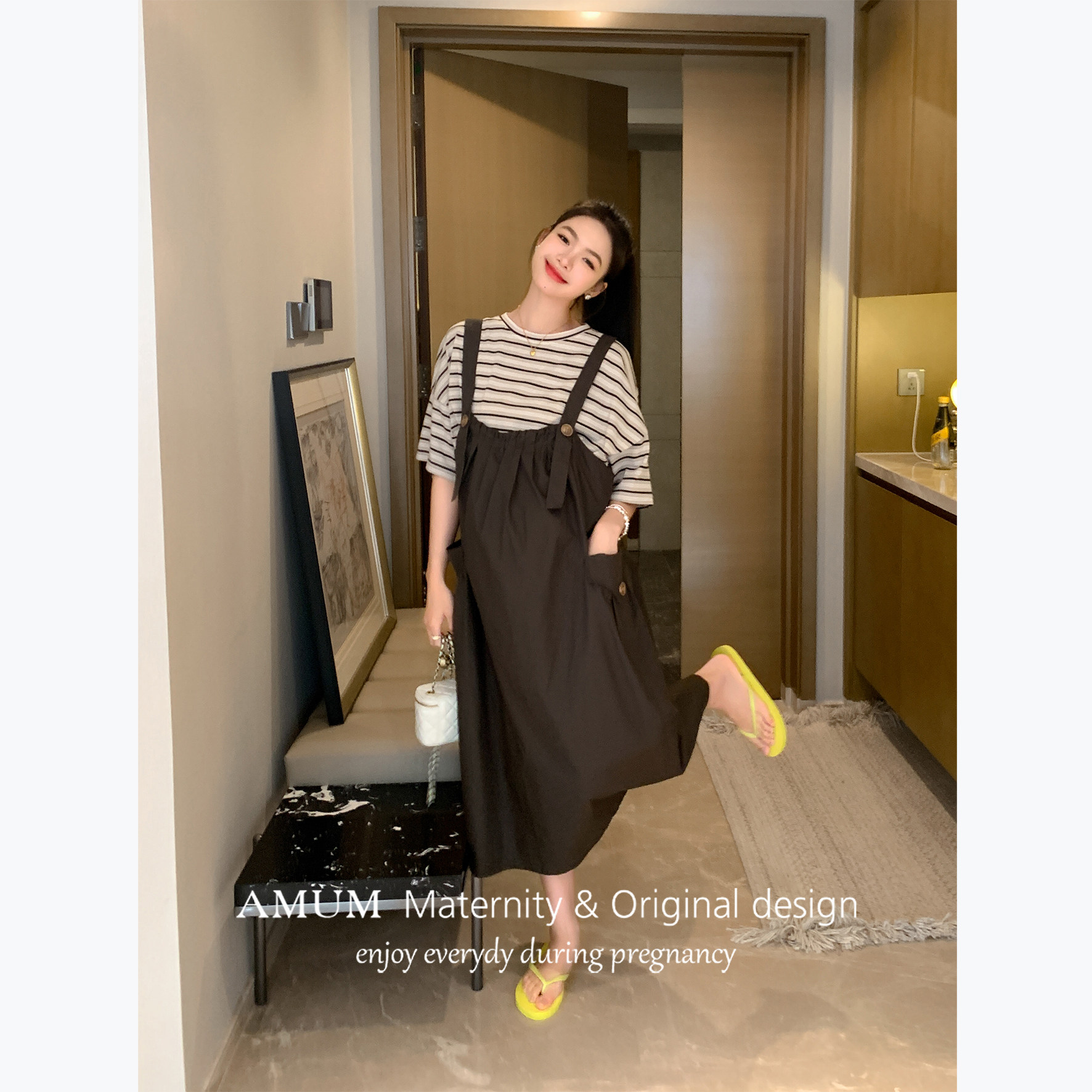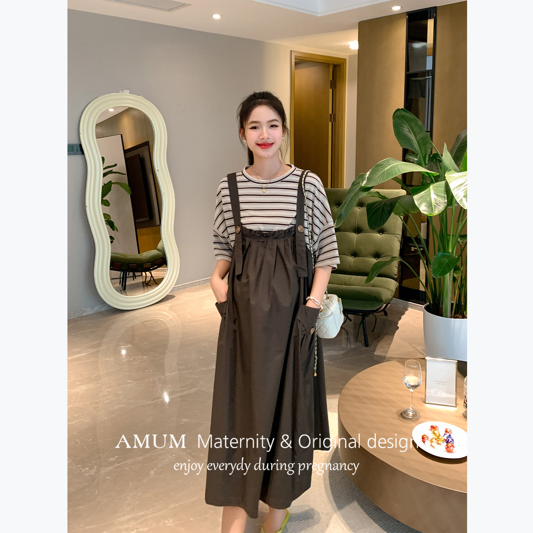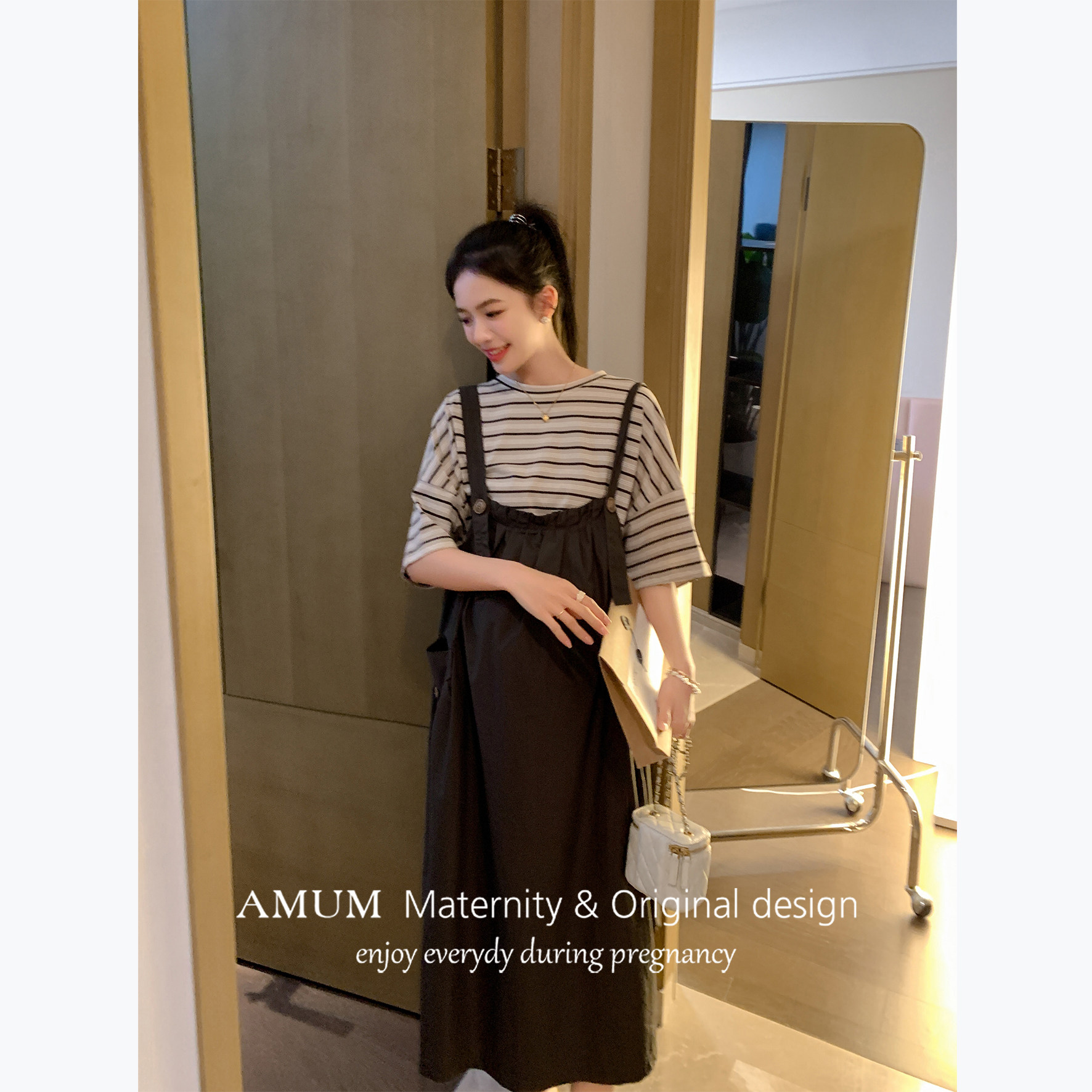 AMUM孕妇装◆初夏茶话会系列,以舒适与时尚并重,专为孕妈打造优雅夏日穿搭。这款百搭条纹T短袖工装背带连衣裙,采用柔软透气的亲肤面料,轻盈舒爽,贴心呵护孕期肌肤。可调节背带设计,随孕期身形灵活调节,轻松穿脱,包容性强。工装风格融入简约条纹元素,既显活力又不失知性气质,搭配平底鞋或凉鞋,轻松应对日常出行、闺蜜聚会或初夏茶话会等场合。A字版型巧妙修饰身形,隐藏腹部赘肉,展现孕妈专属的温柔魅力。AMUM,让孕期每一天都自在美丽。