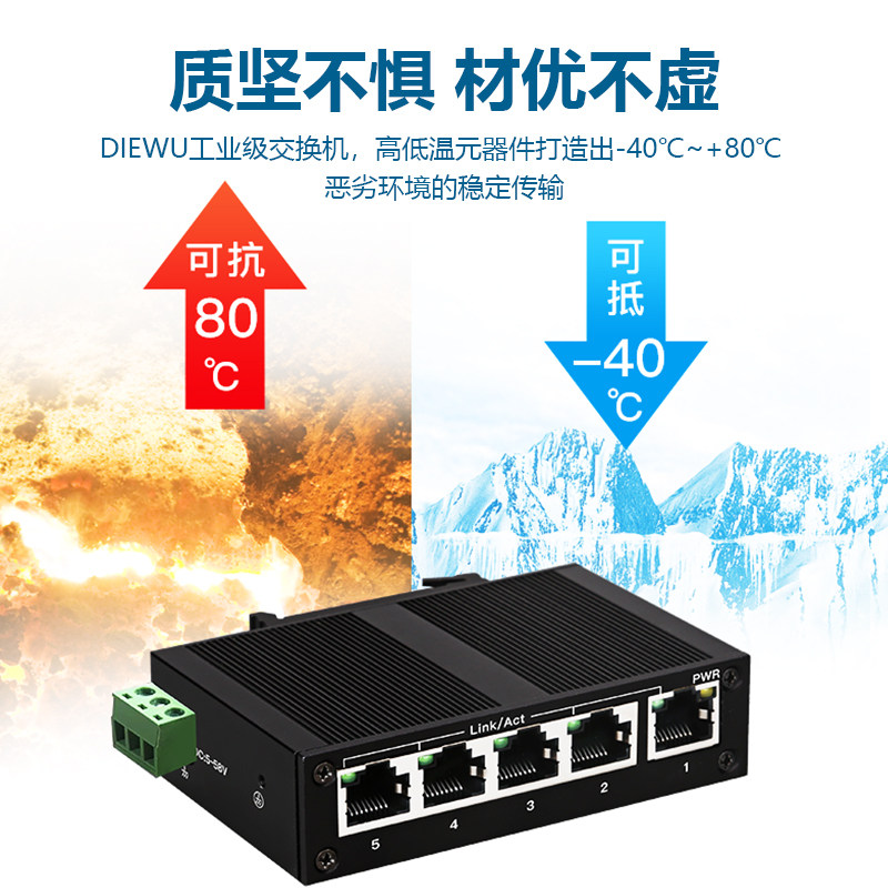 DIEWU工业交换机专为严苛工业环境设计,提供5口、8口、16口多种规格,支持百兆与千兆传输,兼容标准POE供电,满足监控、自动化等场景需求。采用导轨式安装,结构紧凑,适应性强。具备优异的耐高低温性能(-40℃~75℃),防尘防潮,可在变电站、交通、工厂等恶劣环境中稳定运行。支持250米远距离数据传输,远超常规以太网限制。遵循工业级高标准,具备高抗干扰、高稳定性与长寿命特点,支持即插即用,维护简便,是构建可靠工业网络的核心设备。