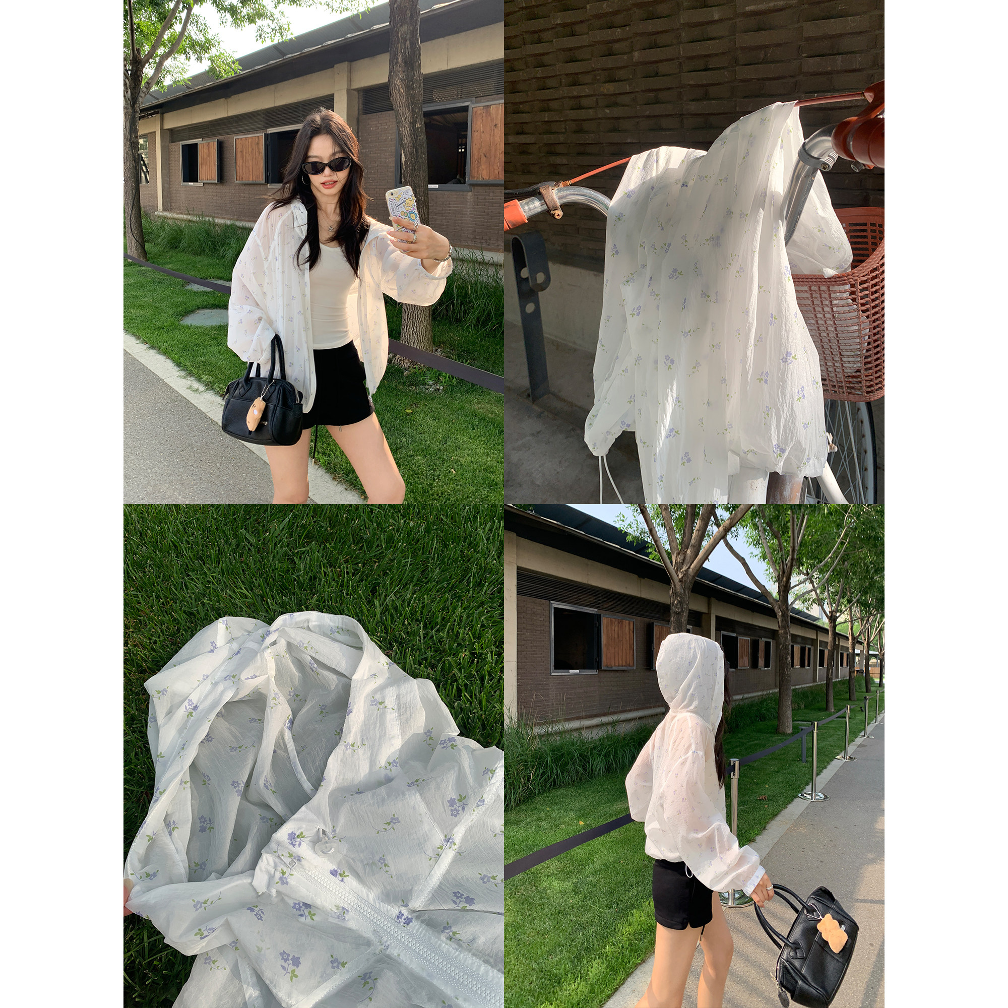 淘宝pusumede【现货7.5折】白色碎花长袖防晒衣外套拉链连帽开衫上衣
