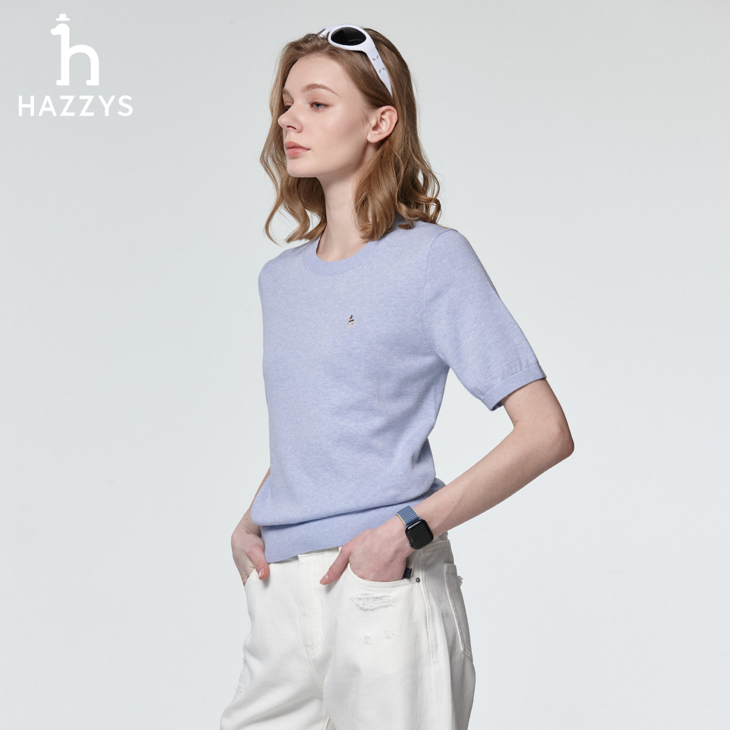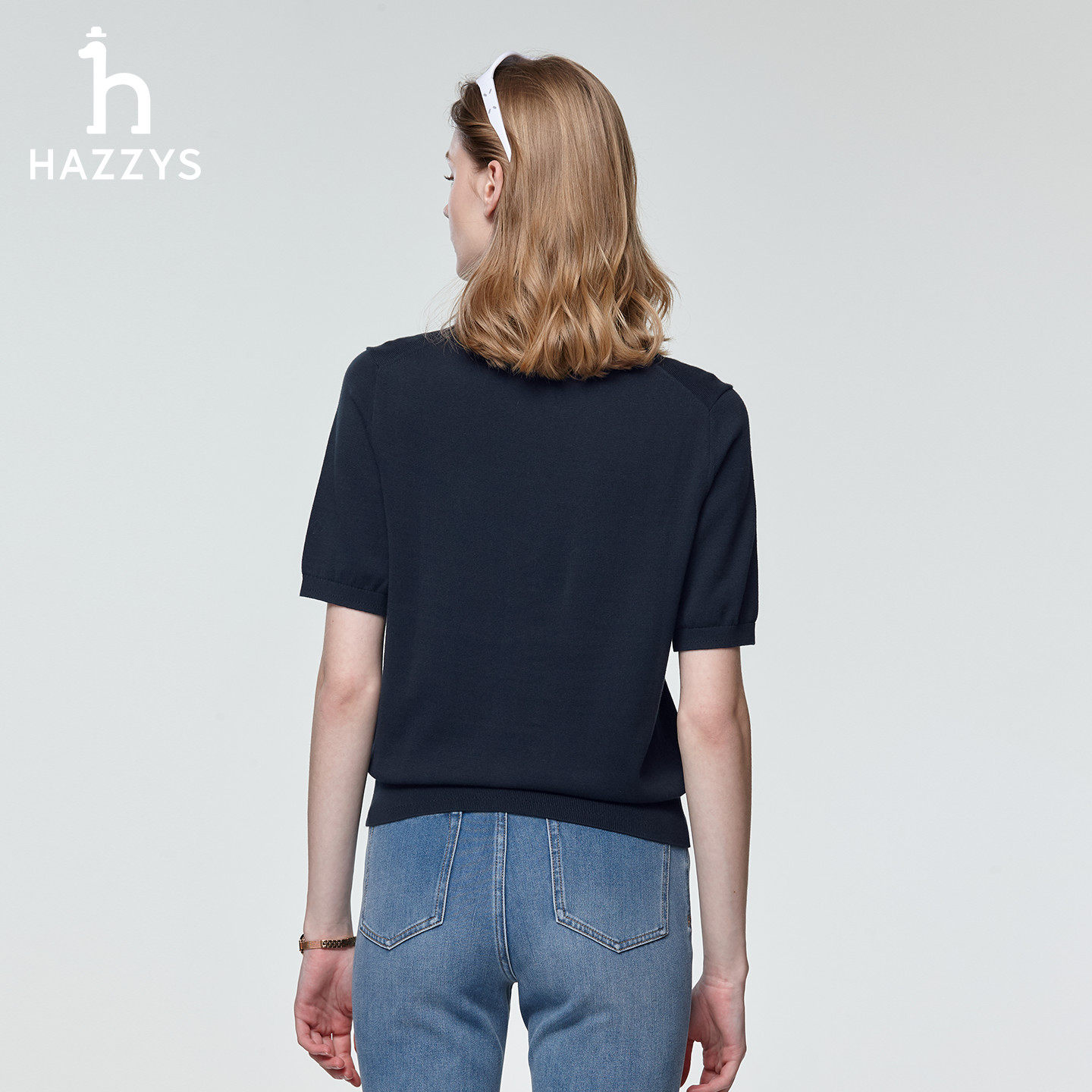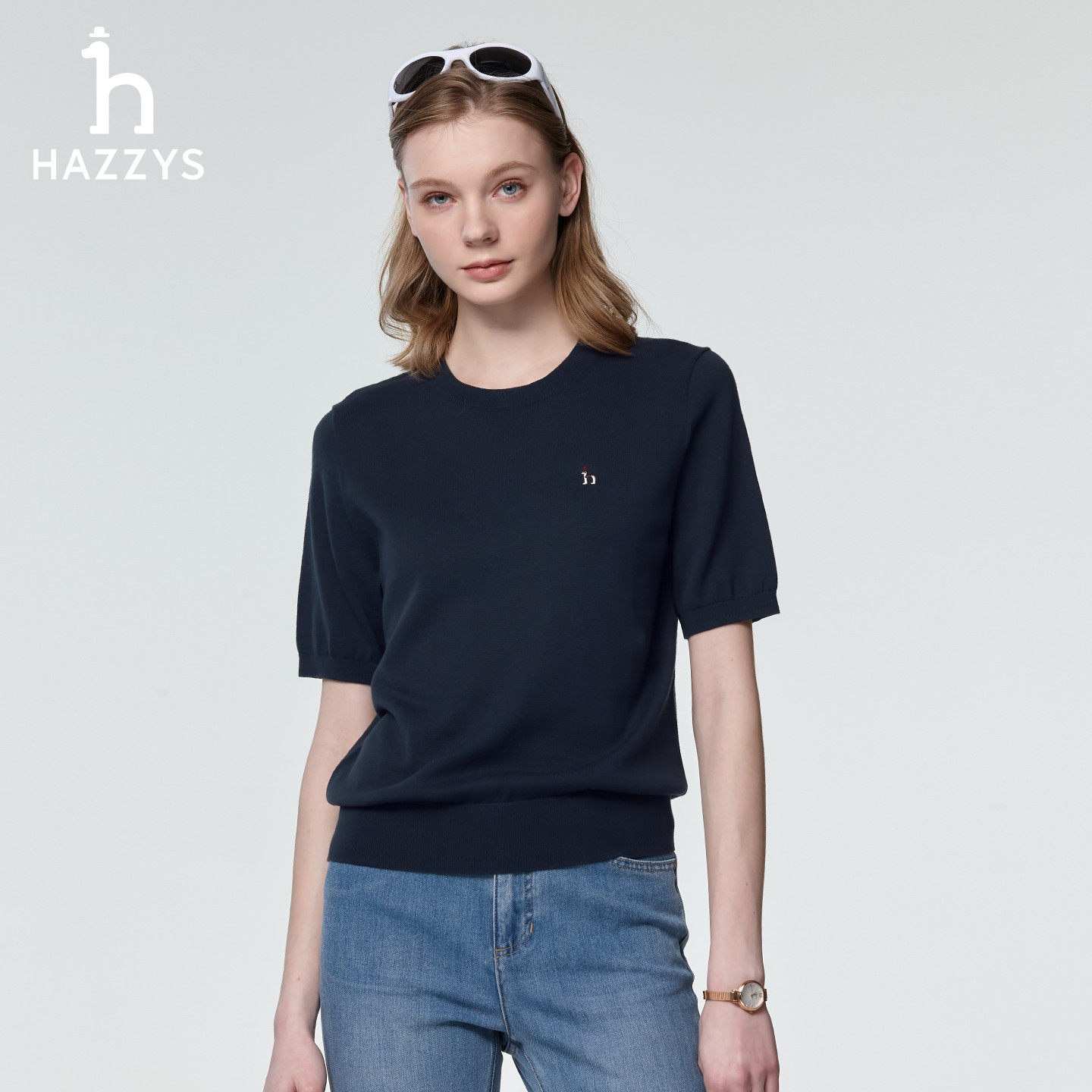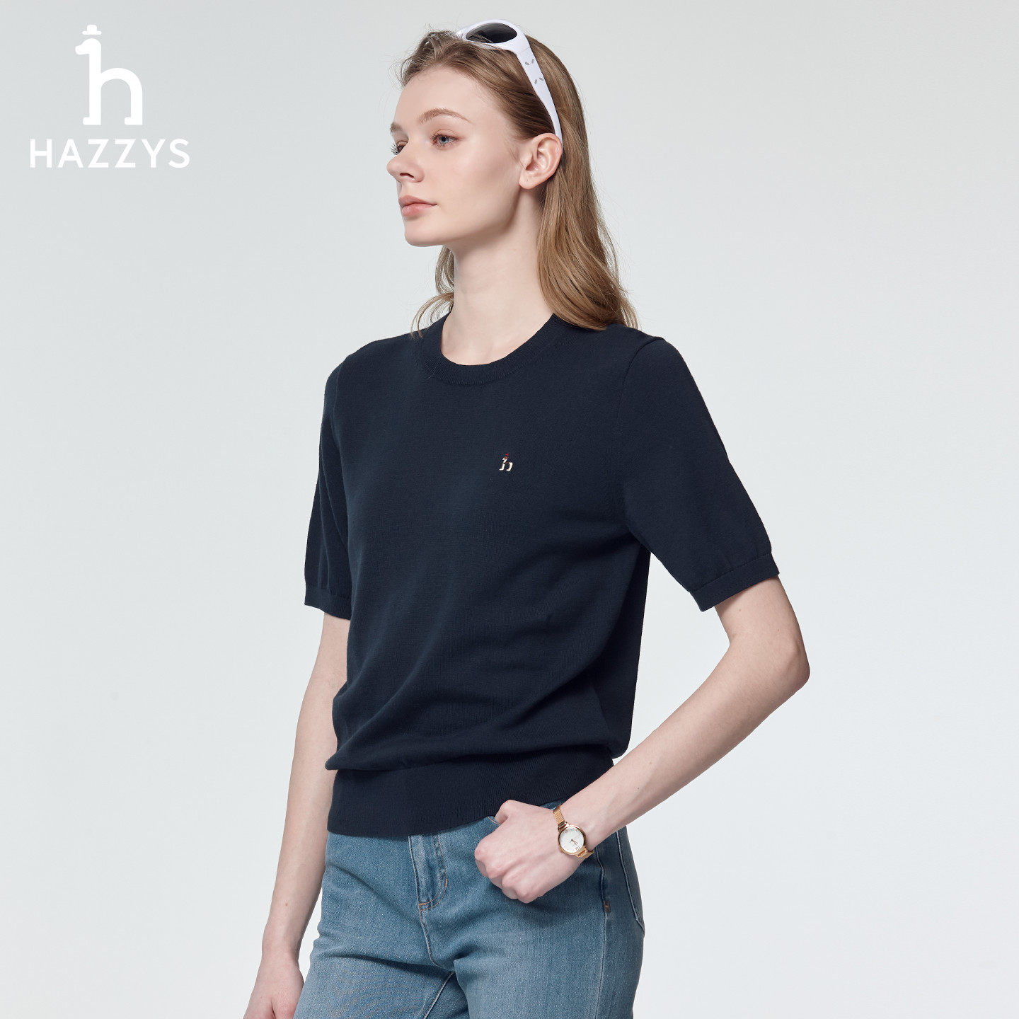 天猫Hazzys哈吉斯短袖针织衫女士春季时尚休闲通勤打底衫圆领套头上衣