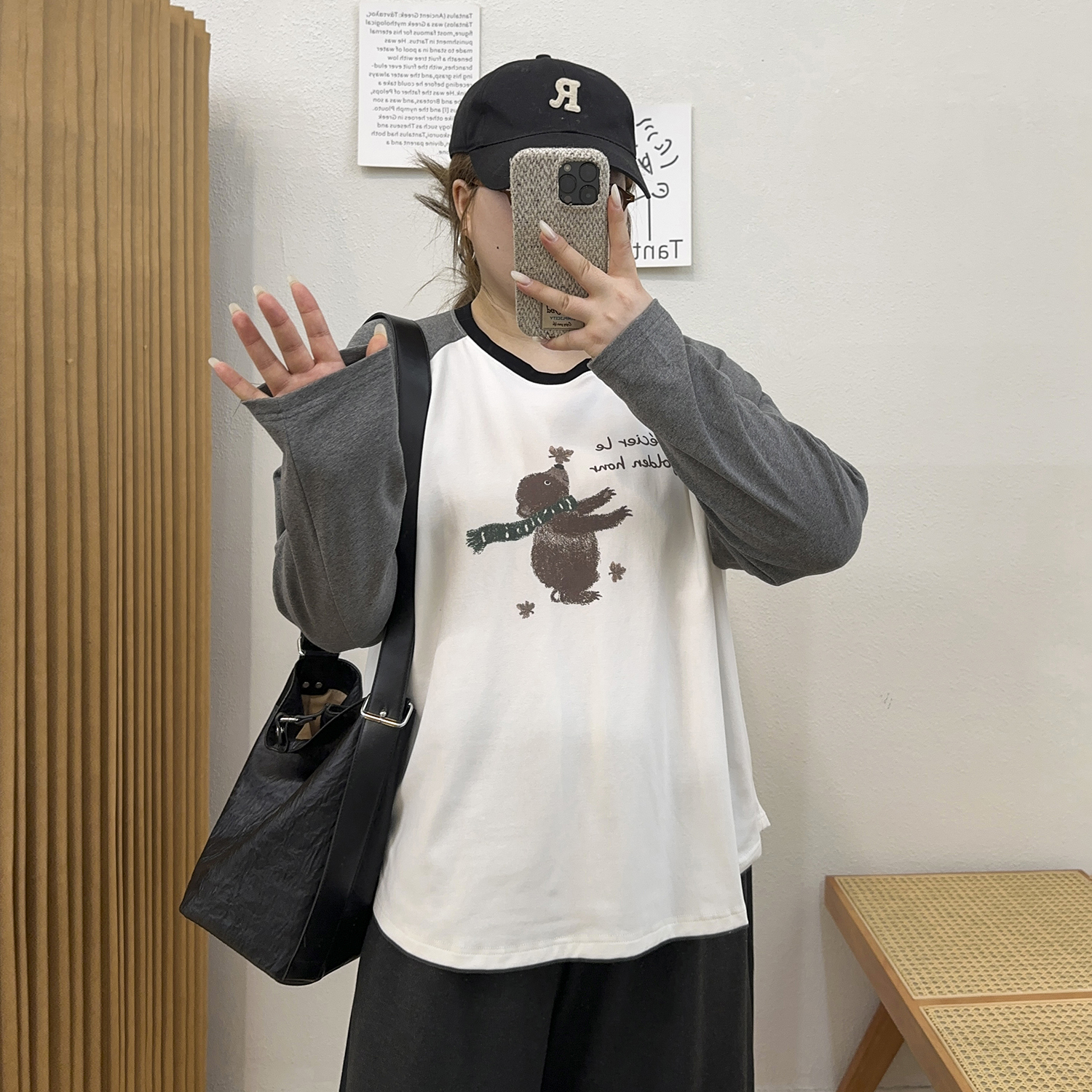 蓝若水大码女装2025秋季新款插肩袖印花希尔棉T恤微胖MM美式上衣