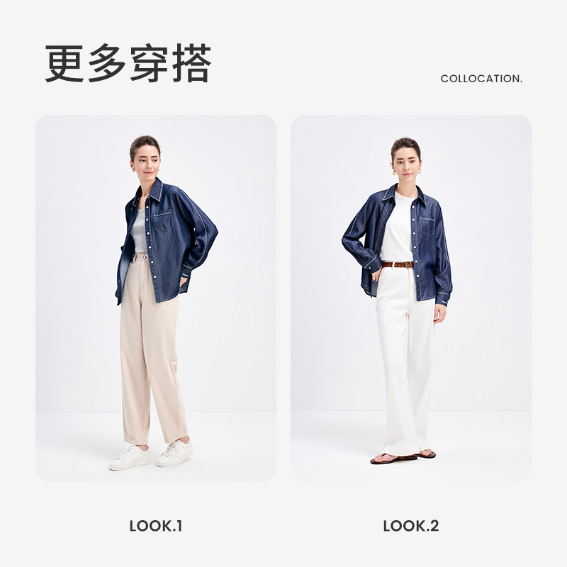 淘郑买买 海港之夜 新款简约V领长袖宽松显瘦莱赛尔天丝衬衫上衣女