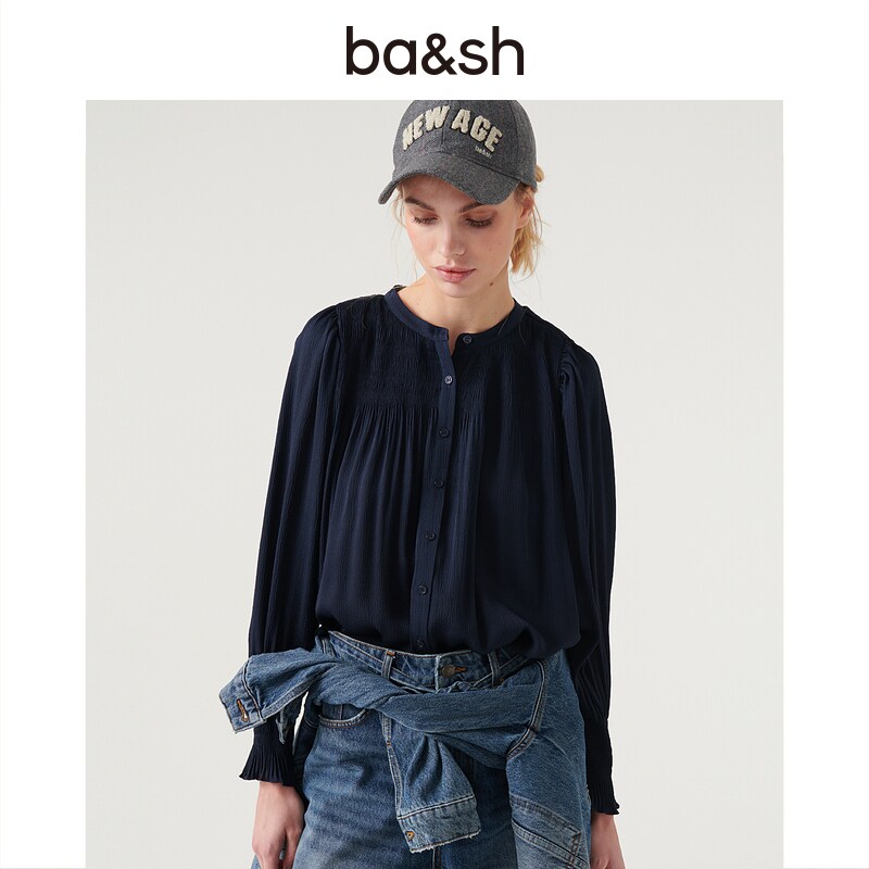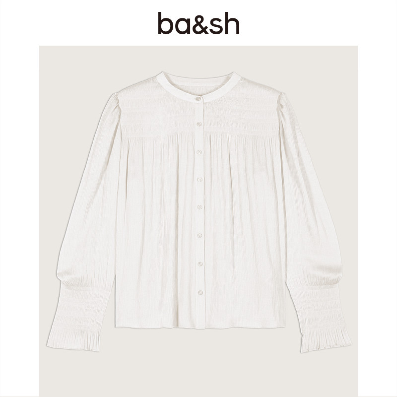 天猫bash春季通勤慵懒风上衣V领女款肌理感压褶缎面法式衬衫1H23KRIZ