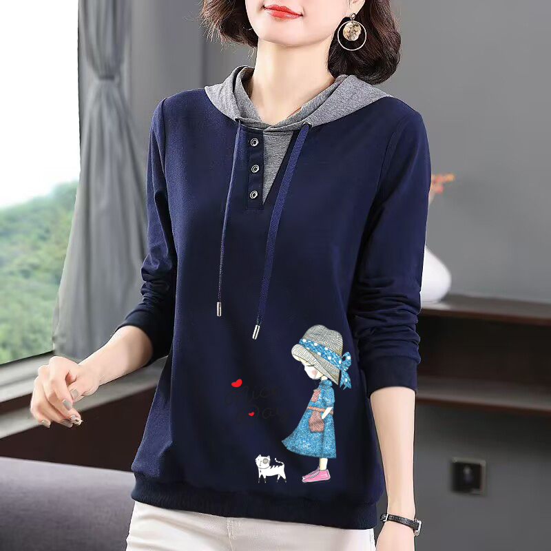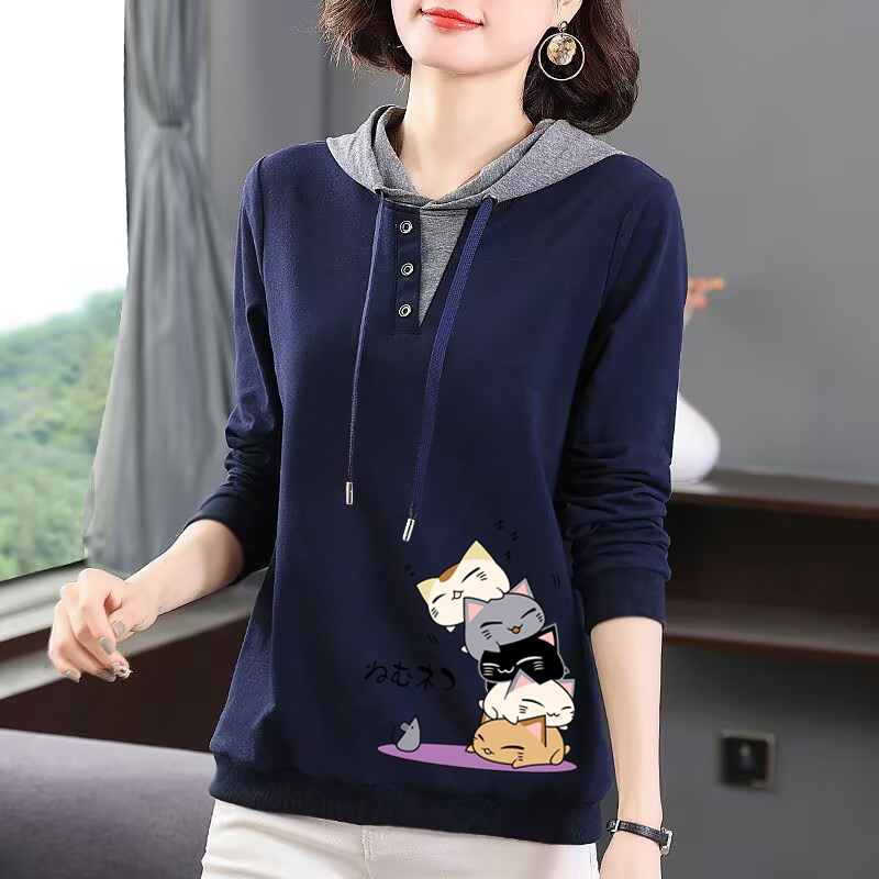 淘宝品牌出口清仓100%纯棉国潮女装长袖连帽T恤衫休闲时尚打底上衣秋