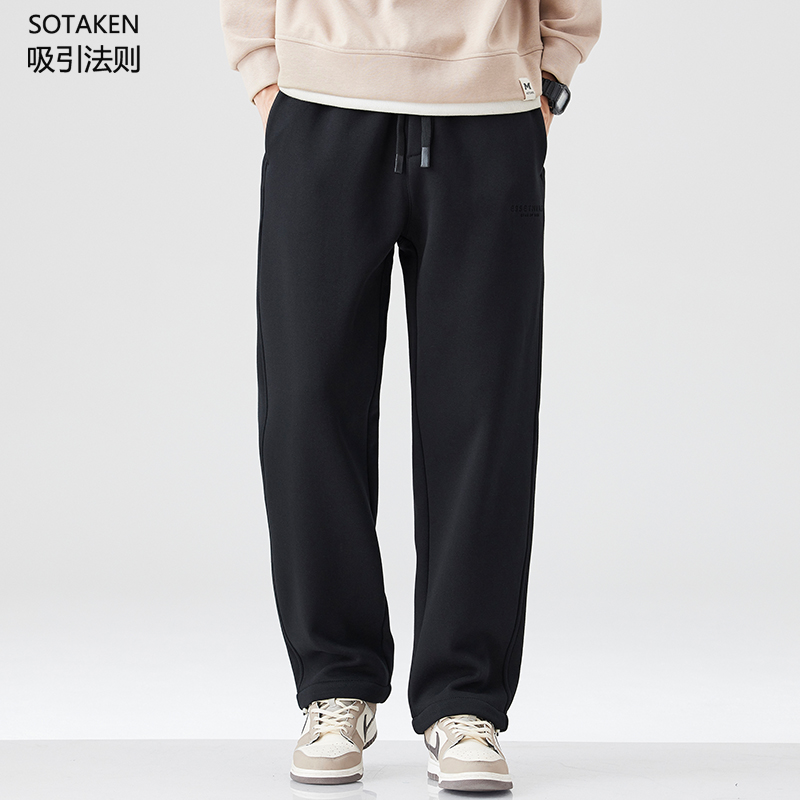 淘宝加绒卫裤男冬季宽松日系针织休闲直筒美式保暖加绒裤灰色长裤字