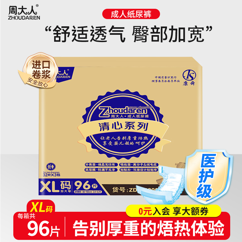 周大人成人纸尿裤是专为老年男女士设计的ML码一次性尿片垫,用于提供舒适且便捷的尿液管理解决方案。这款纸尿裤适用于老年人,材质柔软舒适,提供优质的吸湿性能,有效防止尿液侧漏,让使用者倍感安心。它的设计方便穿戴和更换,确保老年人自主护理的便利性和安全性。这款一次性尿片垫是理想的尿不湿替代品,适合在家中或外出时使用,为老年人带来全天候的舒适体验。
