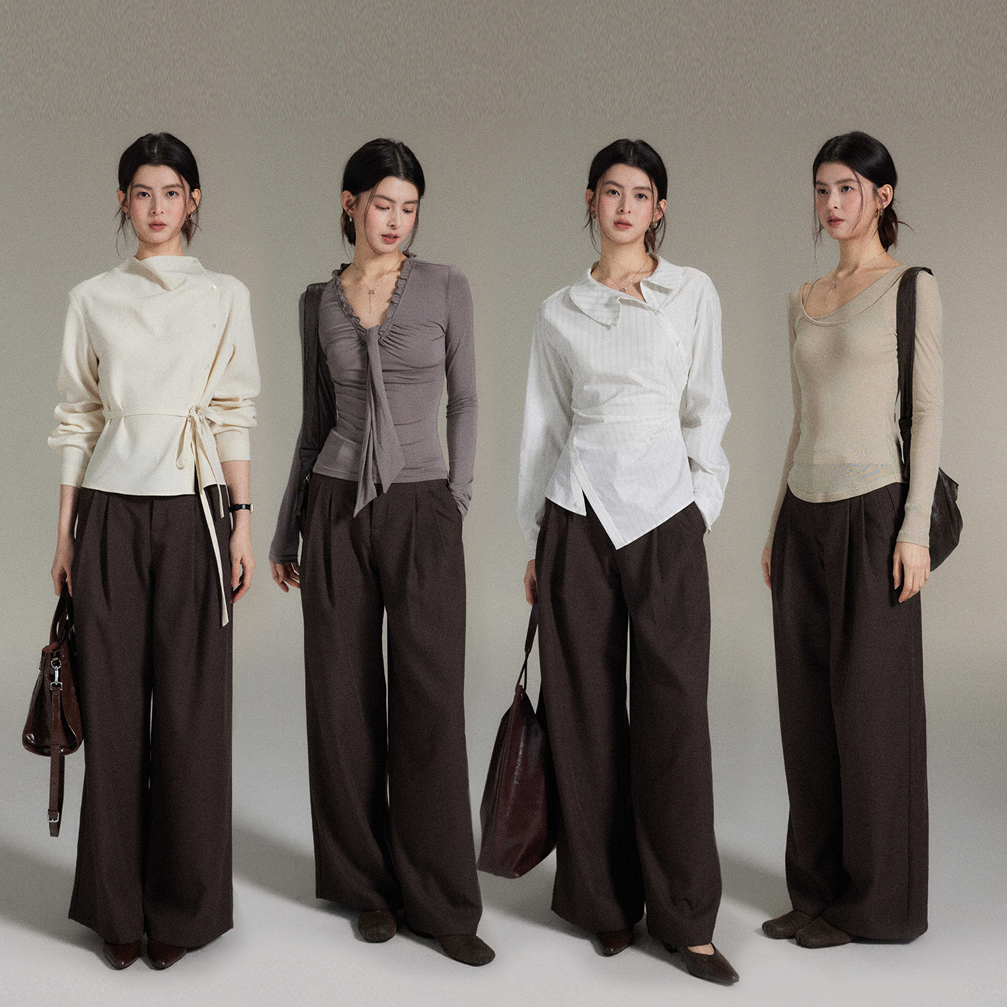 SINGLE MOMENT 25SS秋季新款羊毛混纺多层次飘带休闲阔腿西裤女