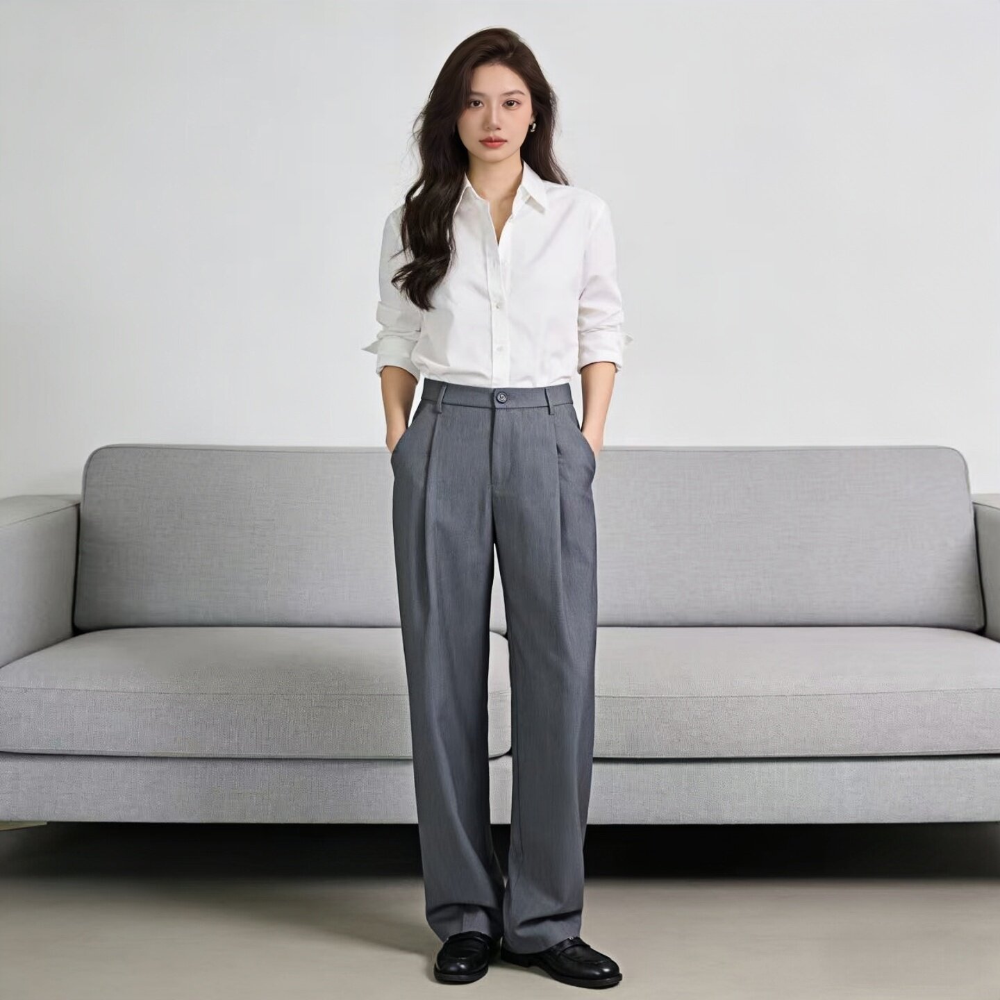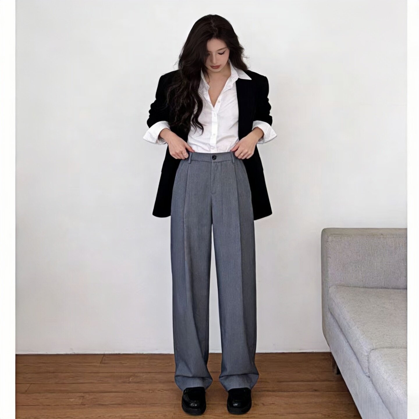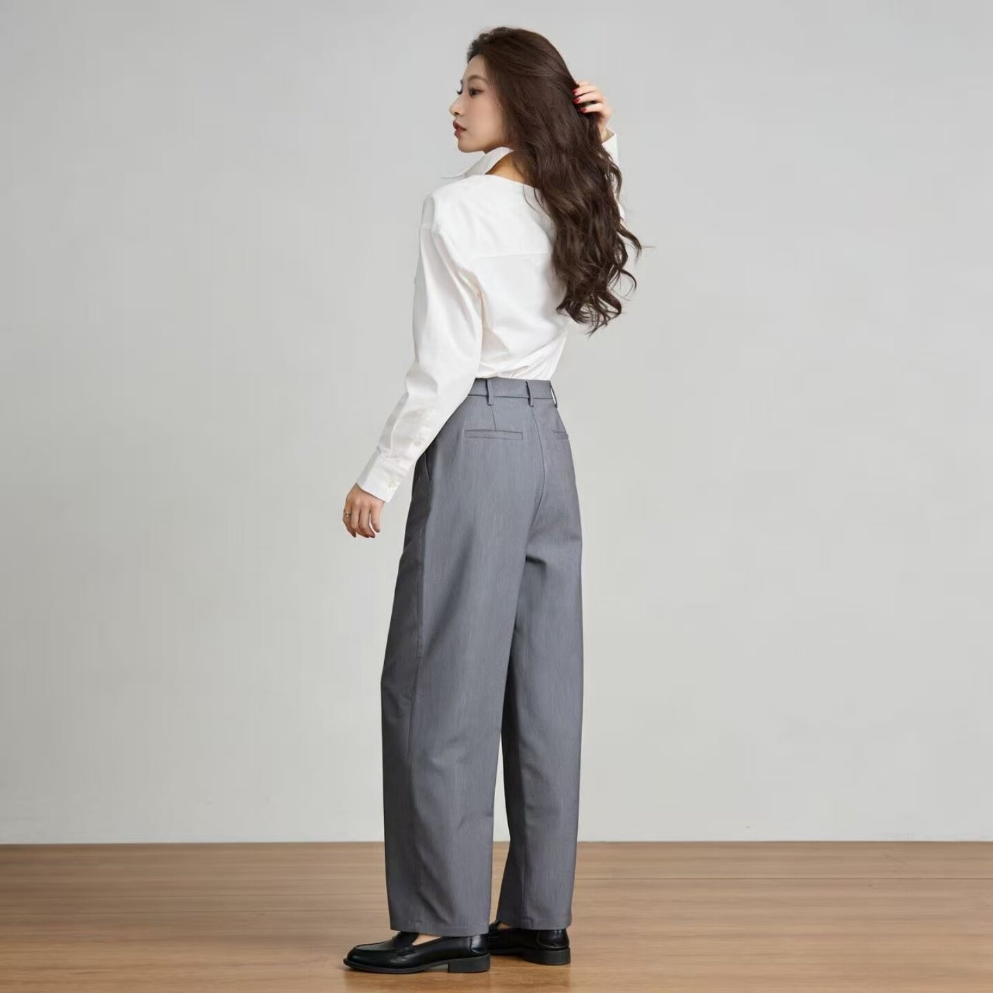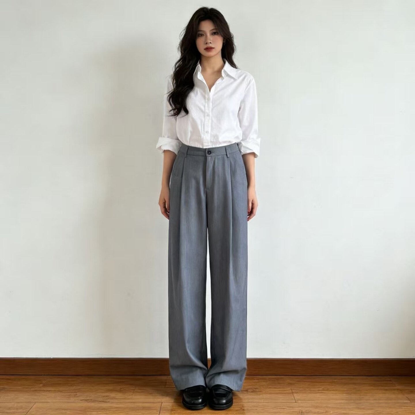 2026春夏秋新款女式高腰阔腿西装裤,融合垂坠感面料与直筒剪裁,轻松打造显瘦修身效果。高腰设计拉长腿部线条,阔腿版型包容各种腿型,行走间尽显优雅气质。精选优质抗皱面料,触感顺滑、垂感自然,兼具舒适与挺括感。简约百搭的版型,可搭配衬衫、针织衫或西装外套,轻松驾驭职场通勤或休闲出街场景。无论是春夏的轻盈搭配,还是秋季的层次叠穿,都能展现知性干练又不失松弛感的现代女性魅力。一条好穿又显气质的西裤,轻松成就衣橱经典单品。