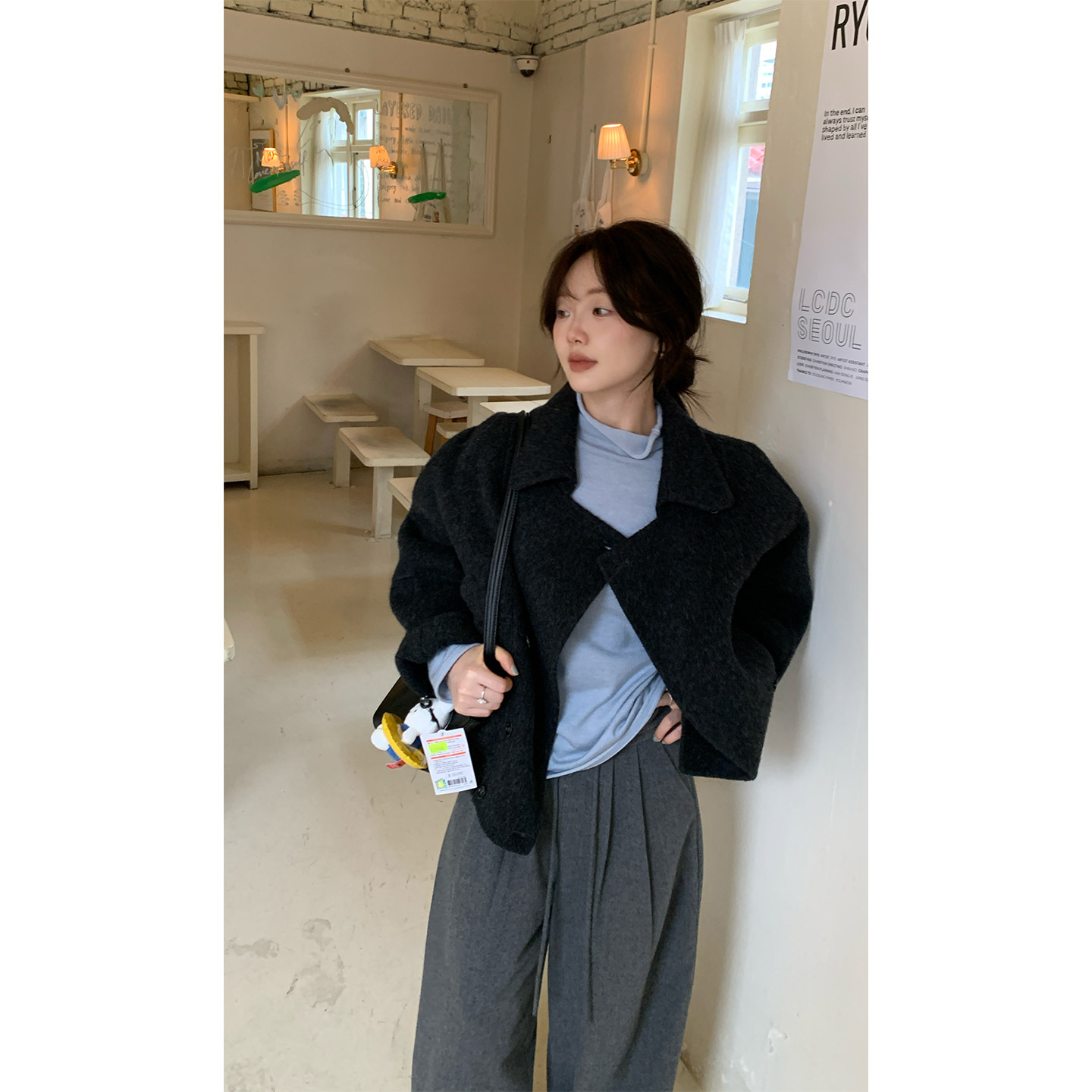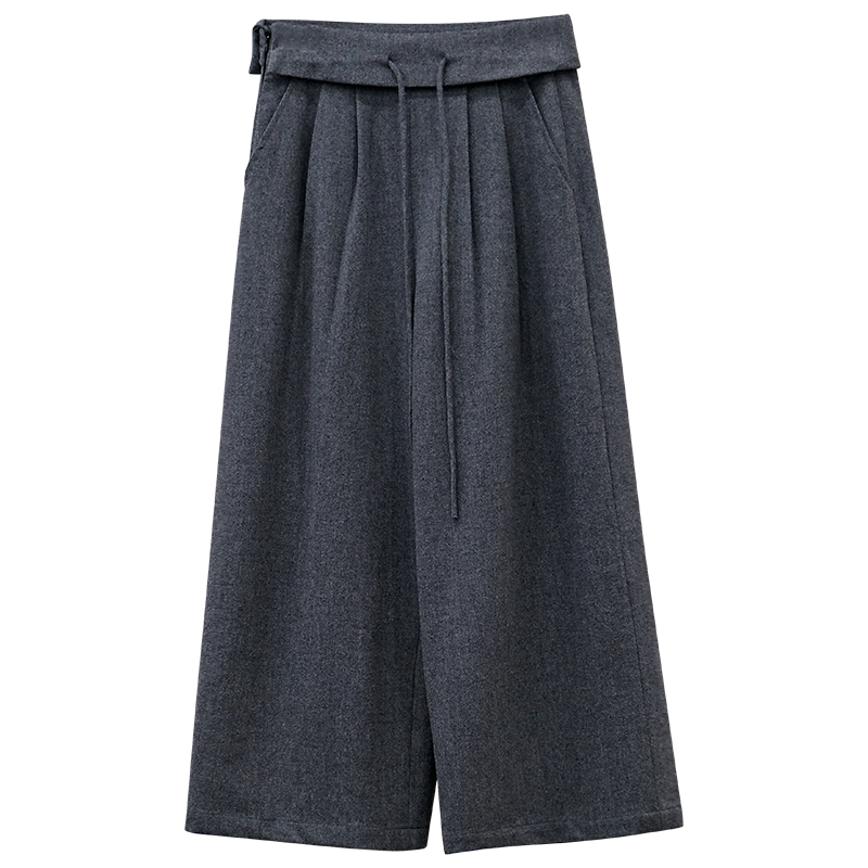 淘宝一三良品小个子 深灰通勤气质翻边系带毛呢阔腿西裤女冬拖地裤子