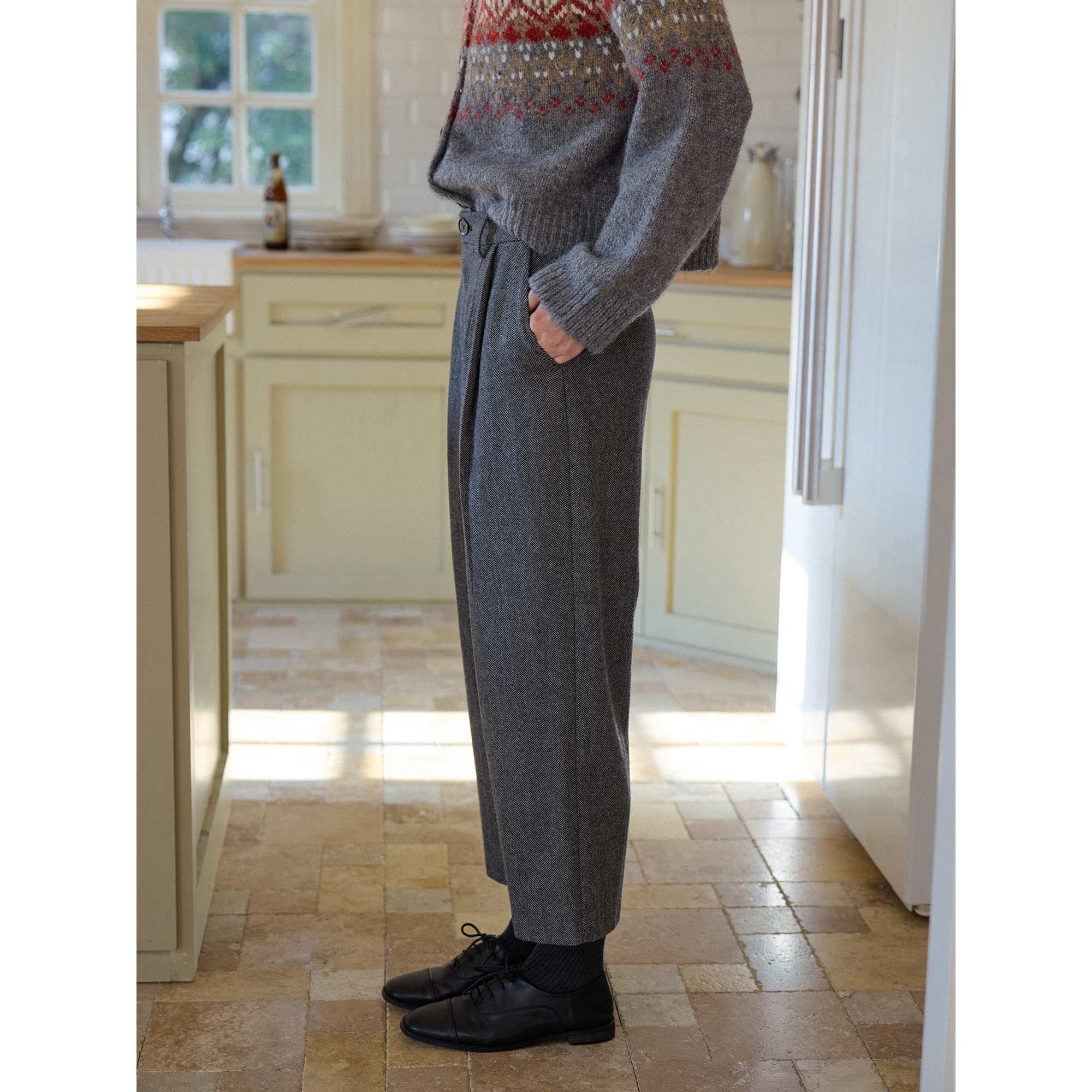 淘宝复古灰色人字纹羊毛毛呢高腰直筒裤九分裤女秋冬季款休闲通勤西裤