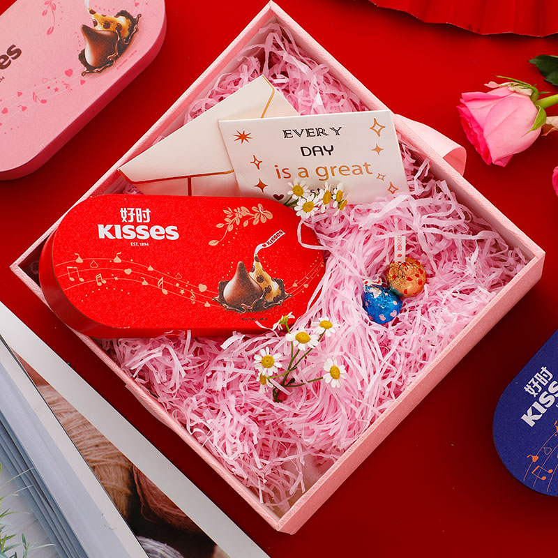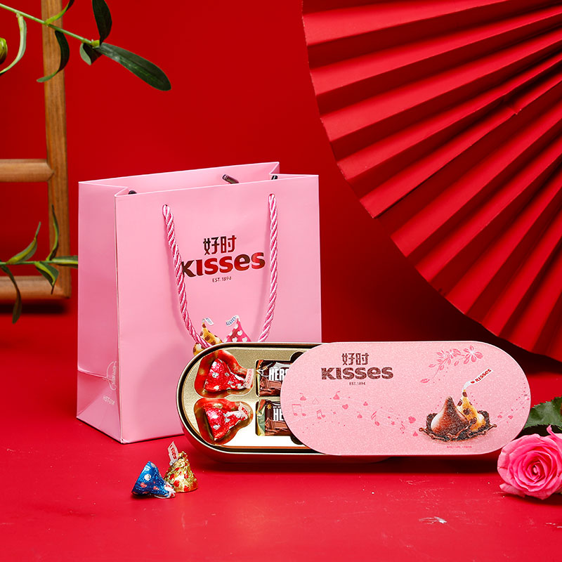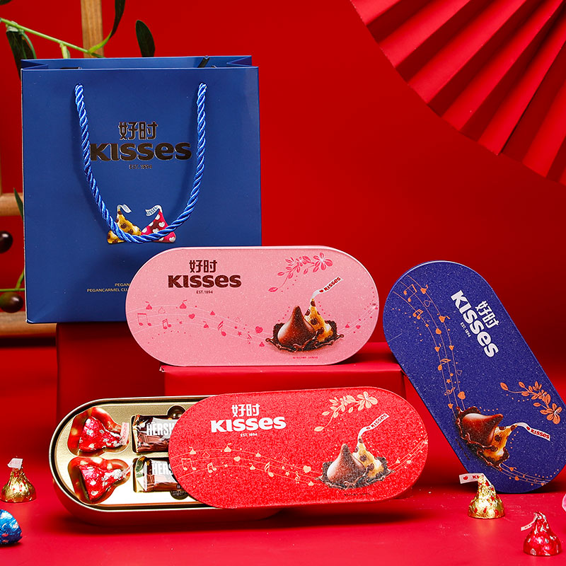 商品介绍:这是一款结婚订婚庆喜糖礼盒,专为新人设计。盒子内含有各种创意糖果,包括知名品牌好时kisses巧克力,成品状态,糖份充足,品质上乘。礼盒设计充满创意,不仅作为婚礼上送给亲朋好友的伴手礼十分得体,更是对嘉宾们表达感激与祝福的完美方式。作为新人的回礼,这款礼盒既体面又实用,展现出新人的诚意与品味。