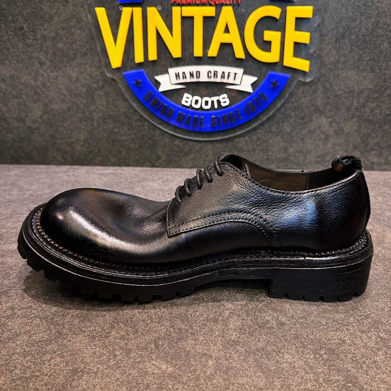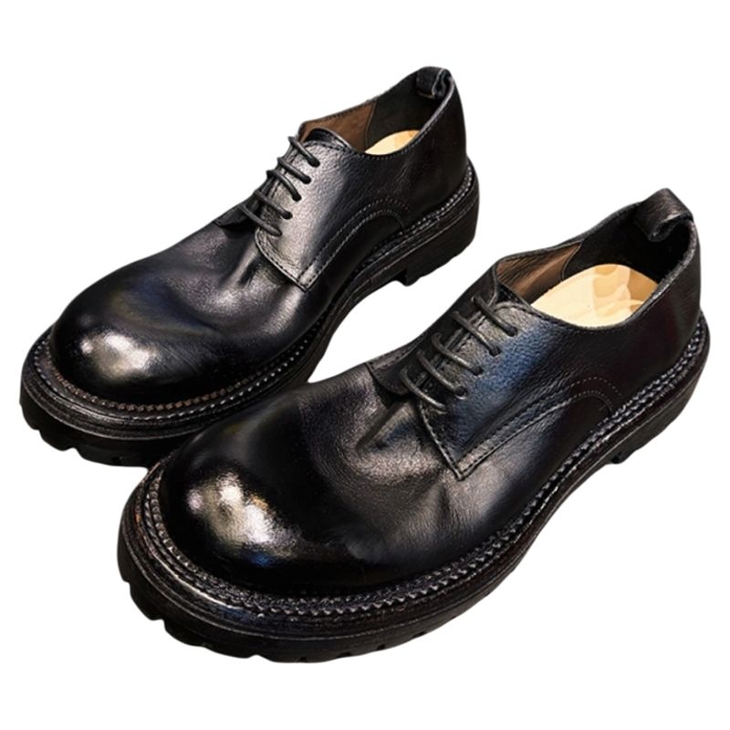淘宝黑色商务休闲厚底水洗马皮德比男鞋透气英伦风手工装软皮皮鞋男款
