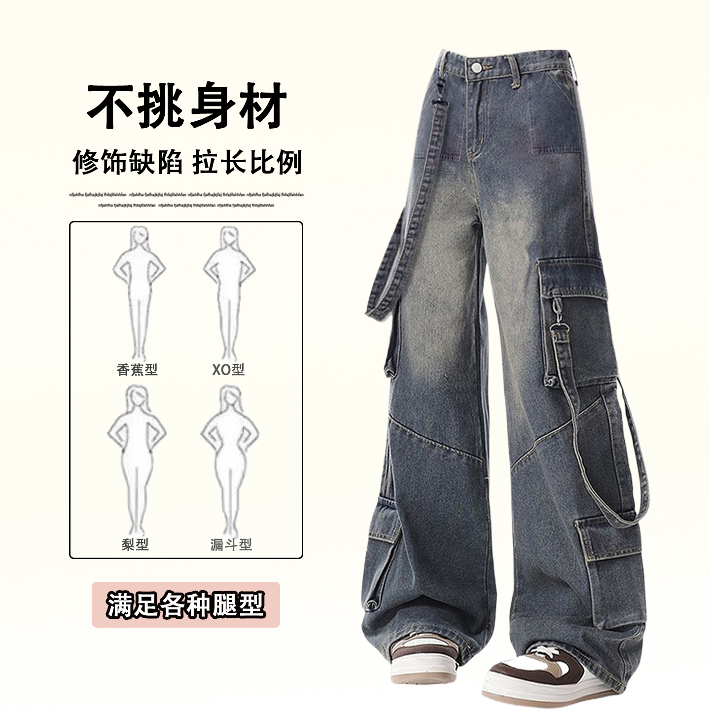 天美式工装风褶皱窄版阔腿牛仔裤女2025秋冬新款宽松显瘦百搭拖地裤
