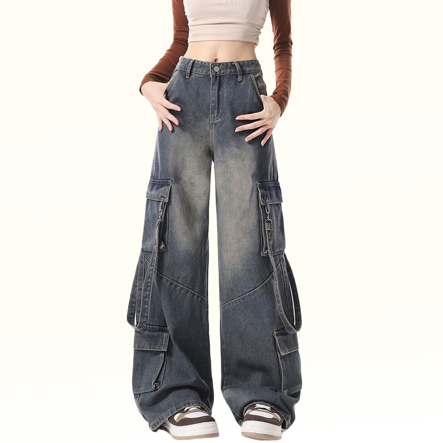 淘宝特大码胖mm复古蓝辣妹风工装牛仔裤女美式vibe风高腰显瘦阔腿裤子
