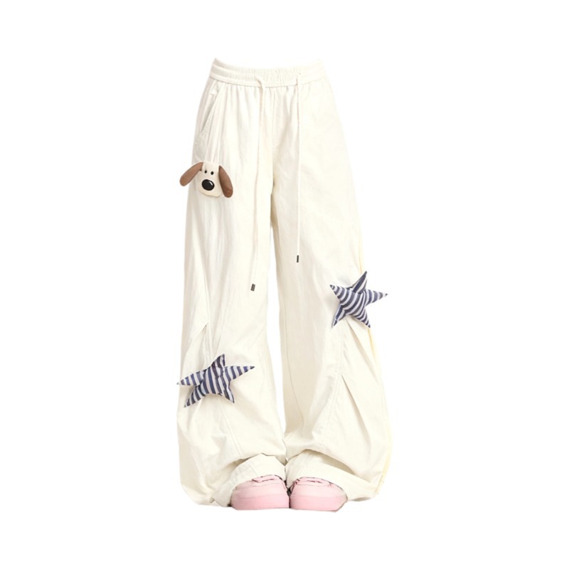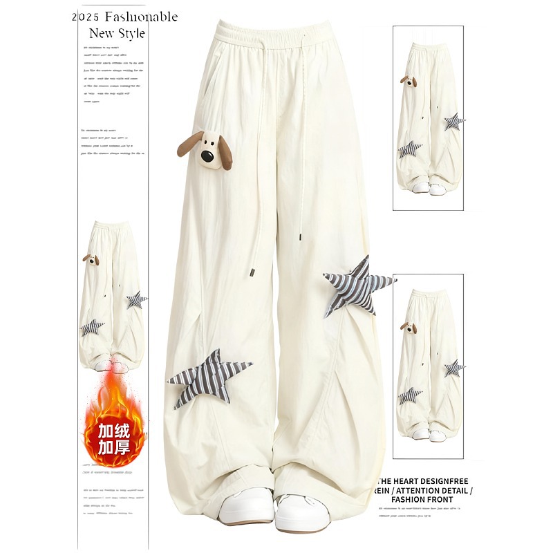 淘宝大码可爱狗狗五角星装饰工装裤女秋冬设计感加绒加厚阔腿保暖裤子