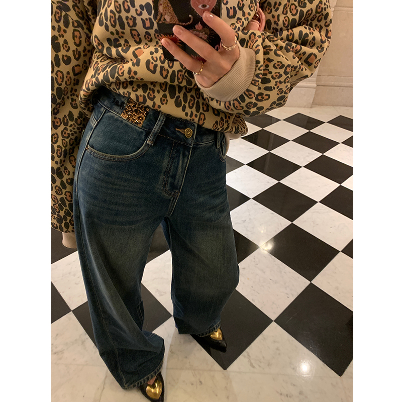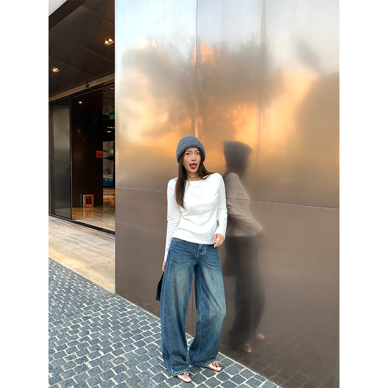 淘稚气丹宁蓝宽松阔腿牛仔裤女2025秋季高腰显瘦垂感拖地直筒裤子